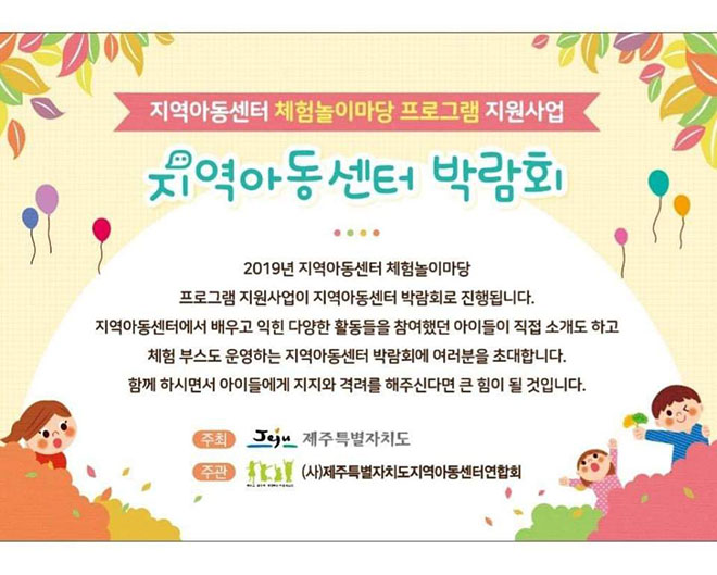 사단법인 제주특별자치도지역아동센터연합회는 오는 9일 오전 11시부터 4시까지 한라체육관에서 ‘지역아동센터 박람회’를 개최한다.