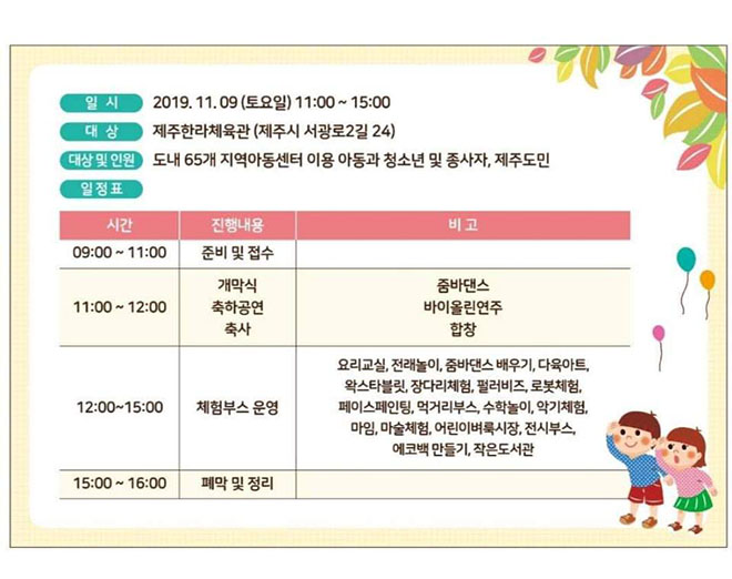 도내 65개 지역아동센터 이용 아동과 청소년 등이 참여하는 이 날 박람회는 제주지역아동센터의 날 개막식을 시작으로 다채로운 체험 부스와 지역아동센터 활동 전시를 통한 홍보 부스, 어린이 벼룩시장 등이 운영될 예정이다.