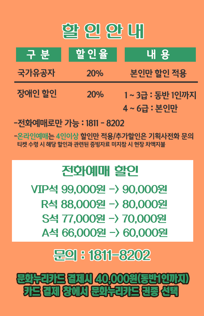 4) 할인가격 : 문화누리카드 이용자 40,000원(좌석 구분 없음)