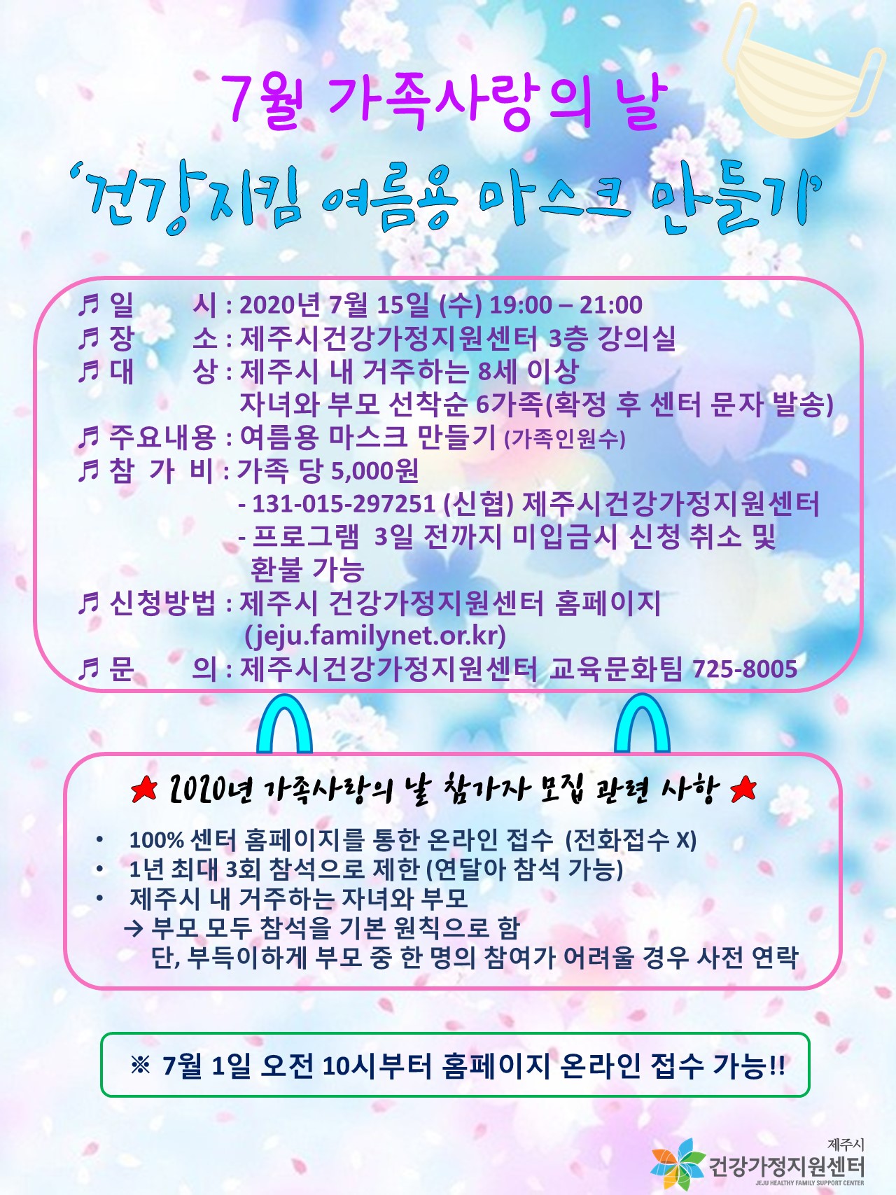 [홍보]제주시건강가정지원센터 7월 가족사랑의 날 '건강지킴 여름용 마스크 만들기' 모집