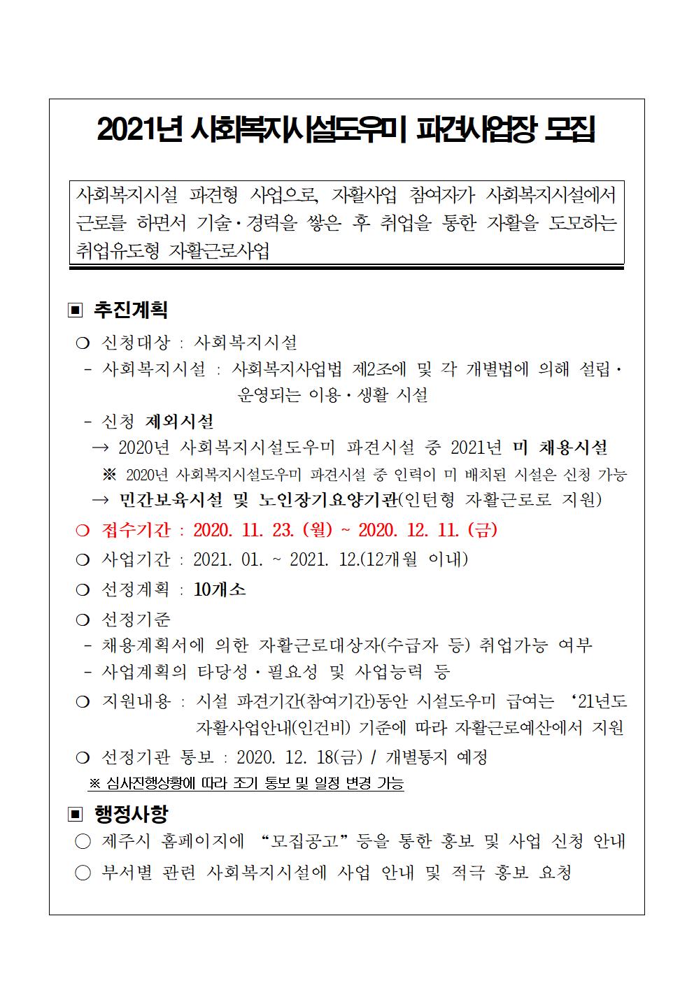2021년 자활근로사업 사회복지시설도우미 파견시설 모집