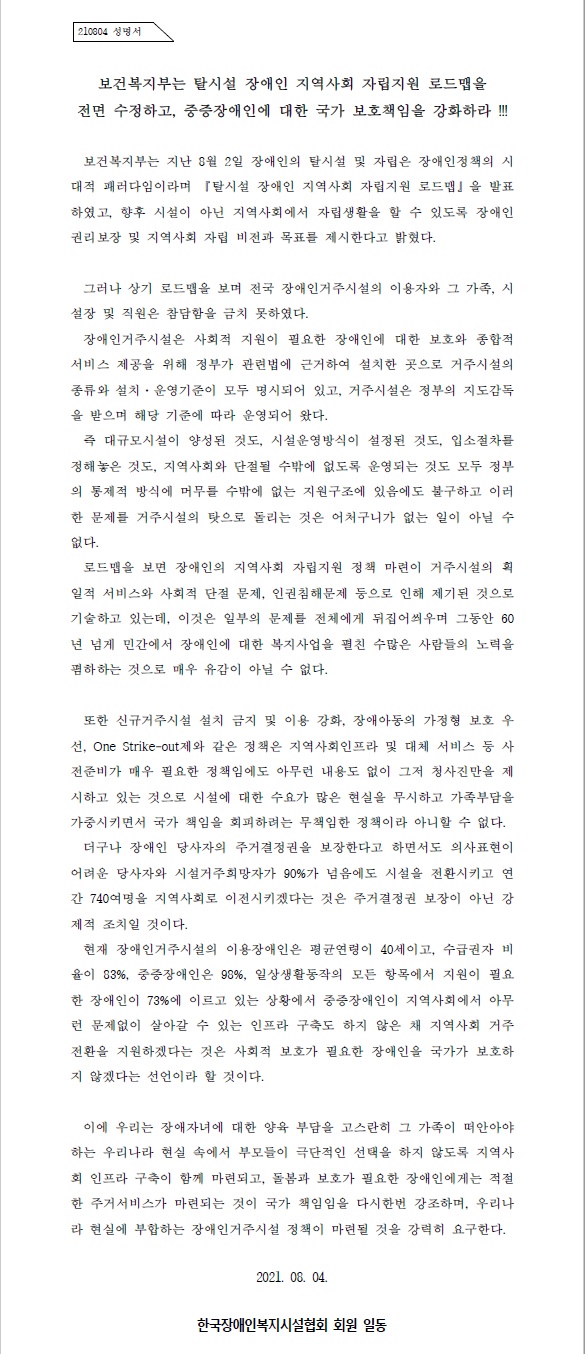 최근 보건복지부가 발표한 「탈시설 장애인 지역사회 자립지원 로드맵」 에 대해 한국장애인복지시설협회(회장 정석왕, 이하 한장협)가 로드맵의 전면 수정과 우리나라 현실에 부합하는 장애인거주시설 정책을 마련할 것을 요구한 성명서 내용입니다. (파일 첨부)