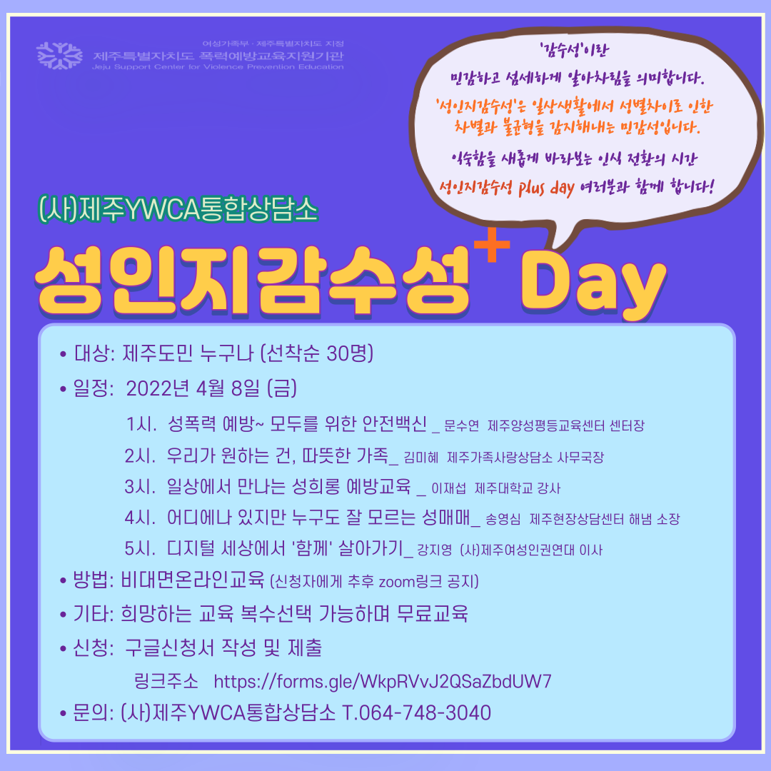 "성인지감수성 Plus Day"에 대한 교육문의는 전화 064-748-3040로
