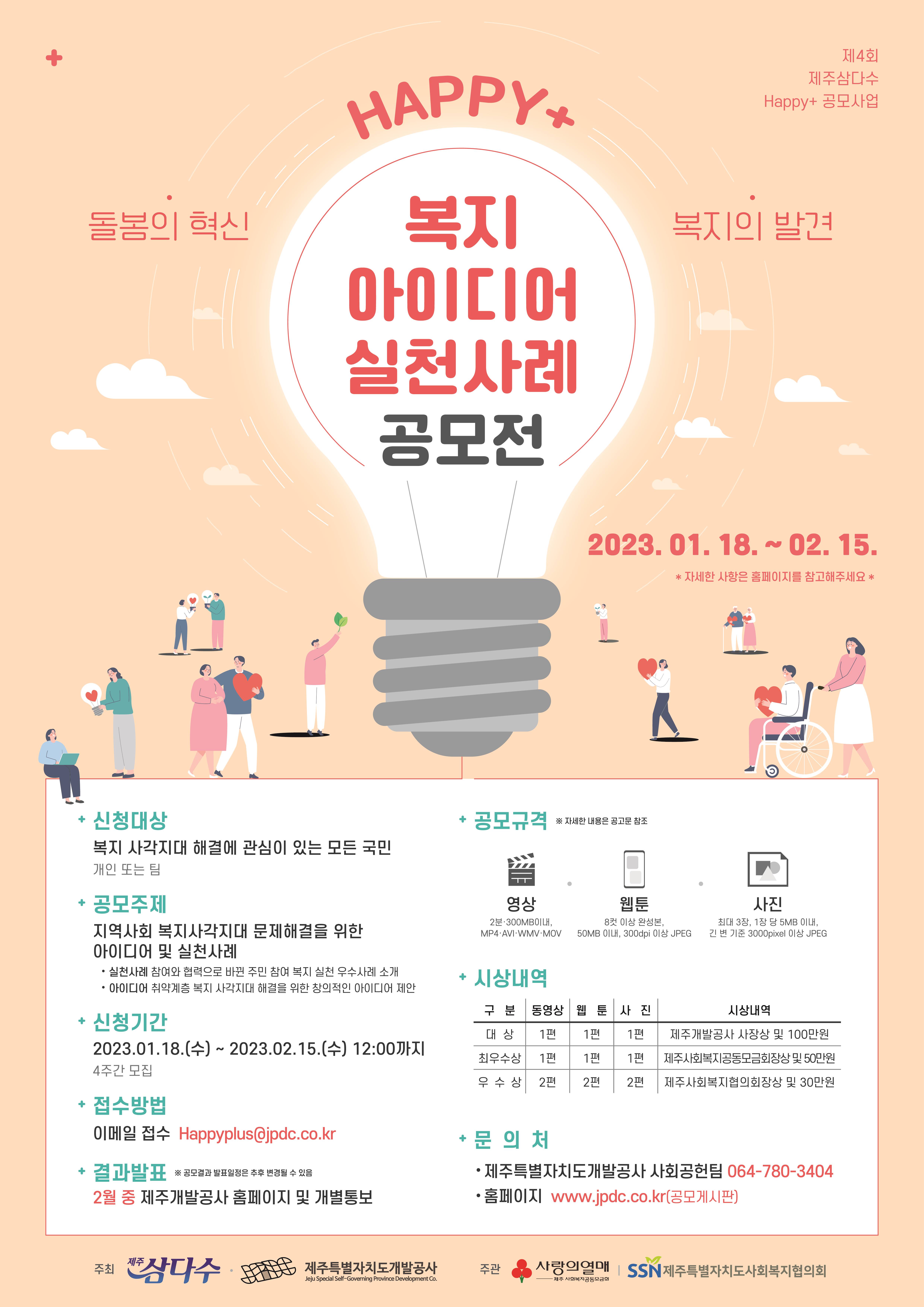 제주특별자치도개발공사에서는 복지 사각지대 해소와 취약계층의 자립을 돕는「제4회 제주삼다수 Happy+」공모사업의 일환으로 ‘돌봄의 혁신, 복지의 발견’ Happy+ 아이디어·실천 사례 공모전 개최를 통해 복지 사각지대에 놓인 취약계층의 현실을 환기시키고, 공동체 차원의 관심과 협력의 필요성을 인식·확산시키고자 하오니, 많은 관심과 참여 부탁드립니다.