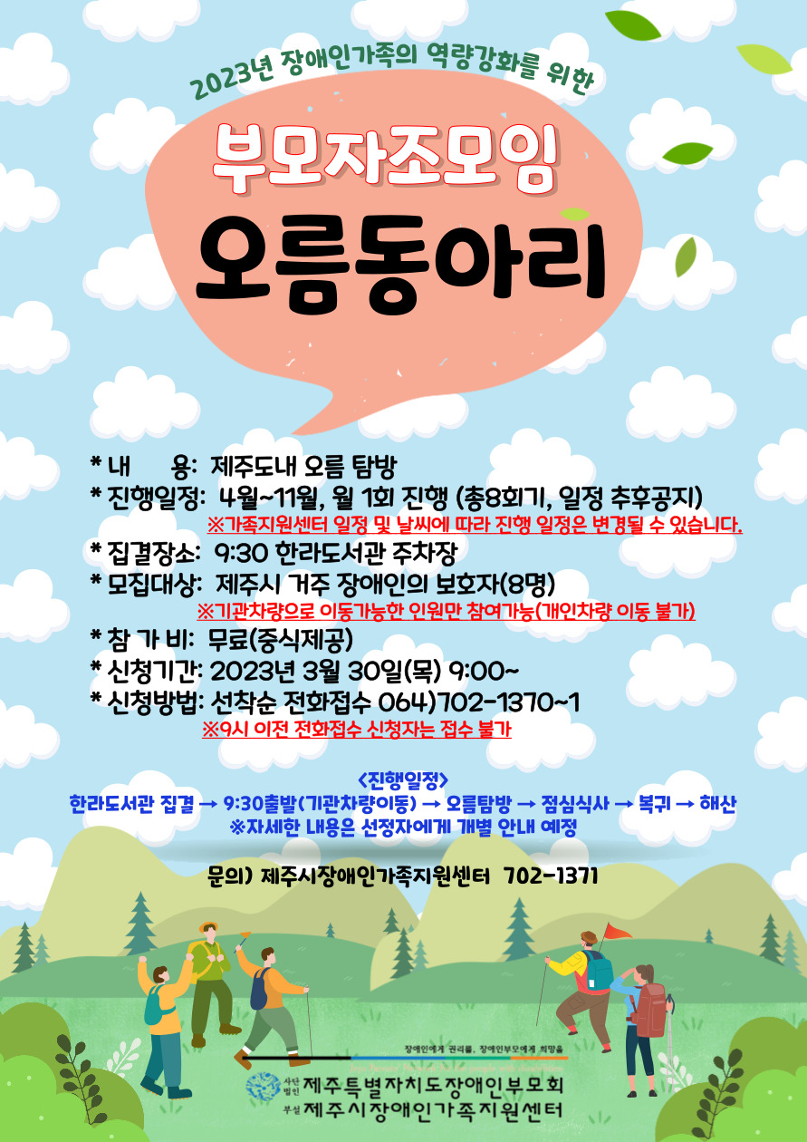제주특별자치도장애인부모회(제주시장애인가족지원센터)에서 부모자조모임 '오름동아리' 참여자를 모집하오니, 많은 관심과 참여바랍니다.