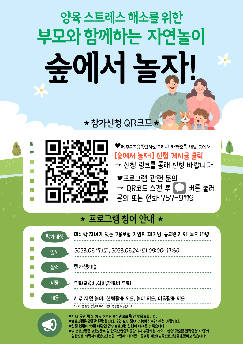 ○ 행사명: 양육 스트레스 해소를 위한 부모와 함께하는 자연놀이 [숲에서 놀자!] ○ 진행: 제주한라대학교 직업훈련센터 ○ 대상: 미취학 자녀가 있는 고용보험 가입자(대기업, 공무원 제외) 부모 10명 ○ 기간: 2023.06.17.(토), 2023.06.24.(토) 09:00 ~ 17:30 총 2회 ○ 장소: 한라생태숲 ○ 내용: 1. 제주 자연 놀이: 지역사회와의 협력, 신체 활동 지도 2. 제주 자연 놀이: 놀이 지도, 미술 활동 지도 ○ 참고: 자녀 동반 가능 여부는 복지관 카카오톡 채널 또는 757-9119로 문의 부탁드립니다.