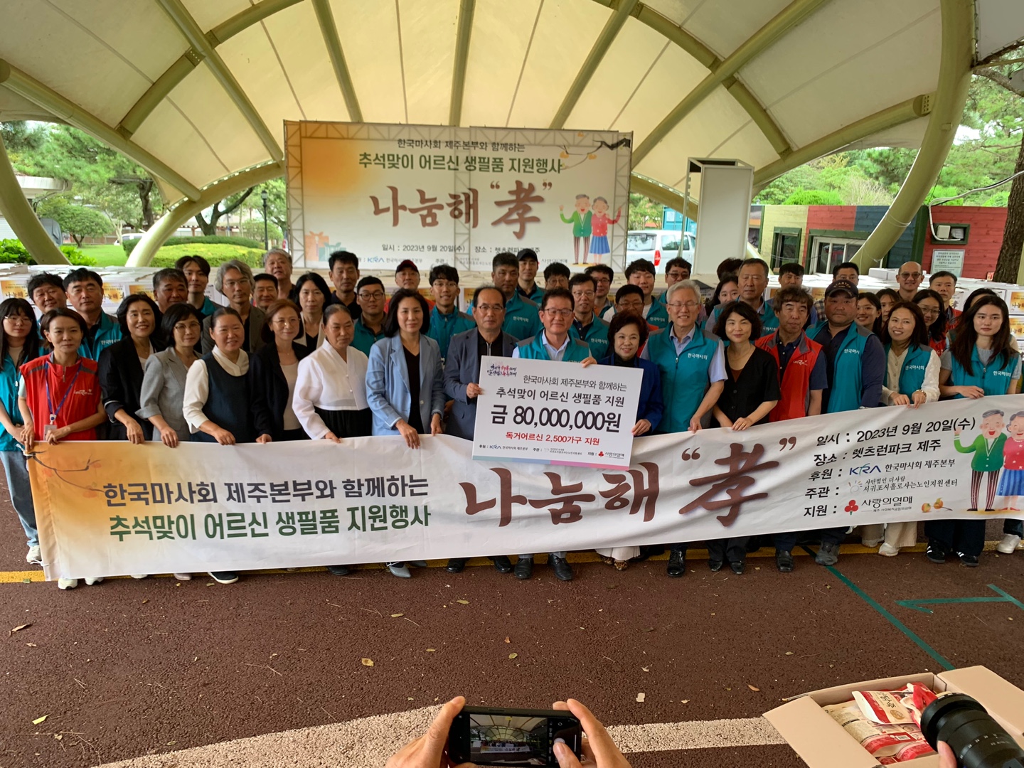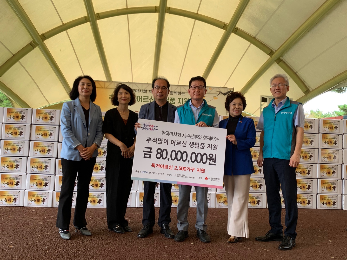 한국마사회 제주본부(본부장 문윤영)는 제주사회복지공동모금회(회장 강지언)에 홀로 사는 노인들에게 식품꾸러미지원을 위해 8천만원을 기탁하였으며, 풍성한 한가위를 보낼 수 있도록 9월 20일 (화) 서귀포시홀로사는지원센터(센터장 이은경)와 식품꾸러미 나눔해孝(효) 행사를 진행하였다.