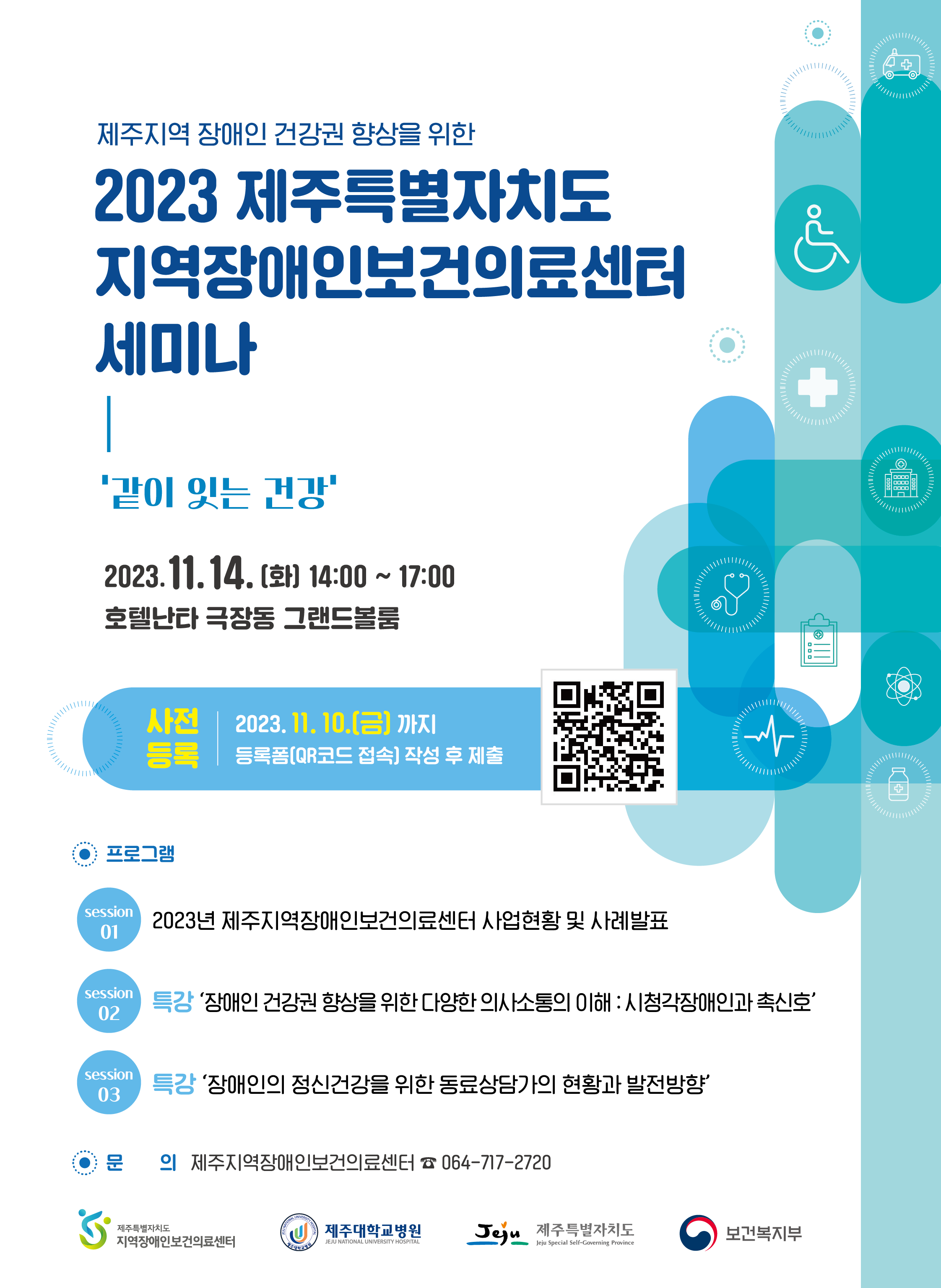제주대학교병원 지역장애인보건의료센터에서는 2023년 건강세미나 '같이 잇는 건강'을 개최합니다.