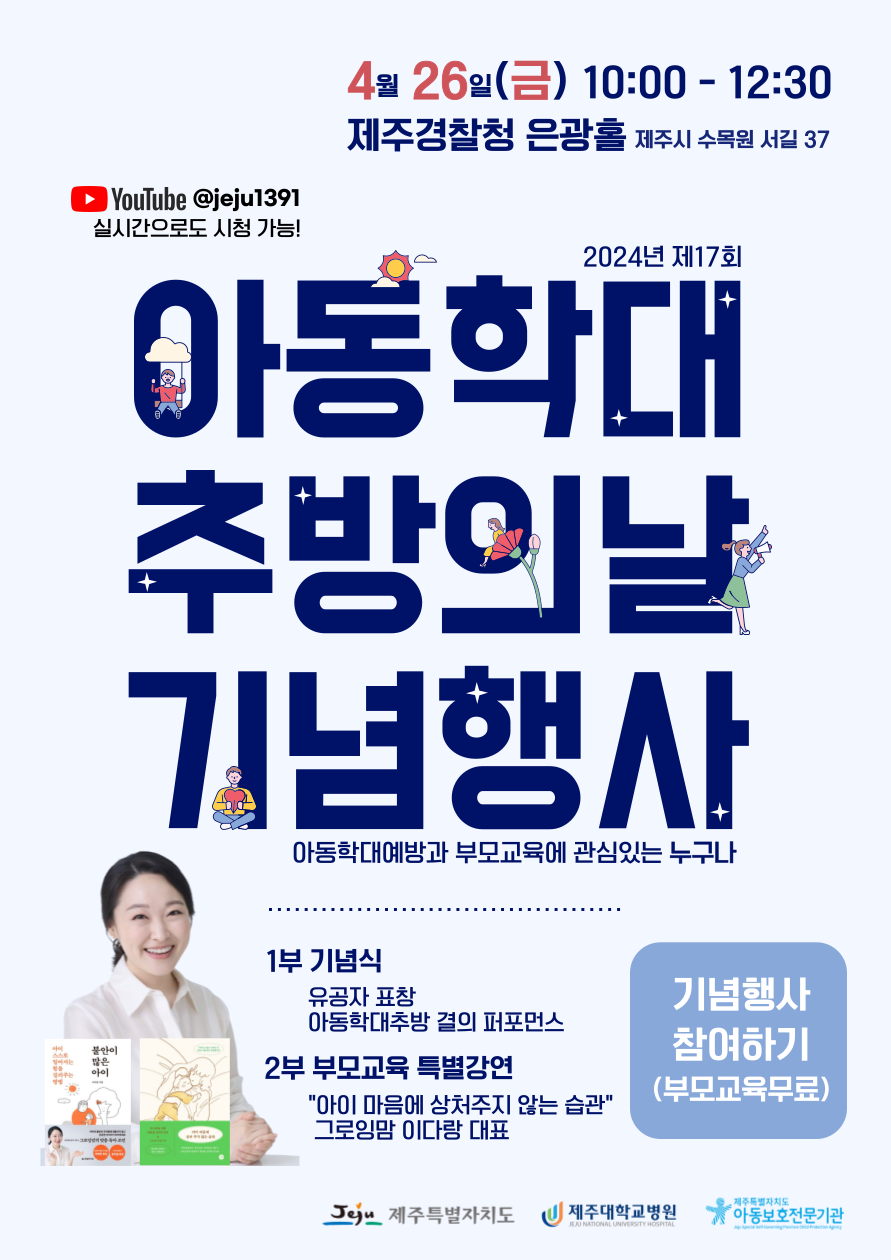 *제주특별자치도는 전국 최초로 [제주특별자치도 아동학대 예방 및 보호에 관한 조례]에 따라 아동에 대한 학대와 폭력의 심각성을 알리고 아동이 건강하게 성장할 수 있도록 4월 27일을 "아동학대 추방의 날"로 제정했습니다.