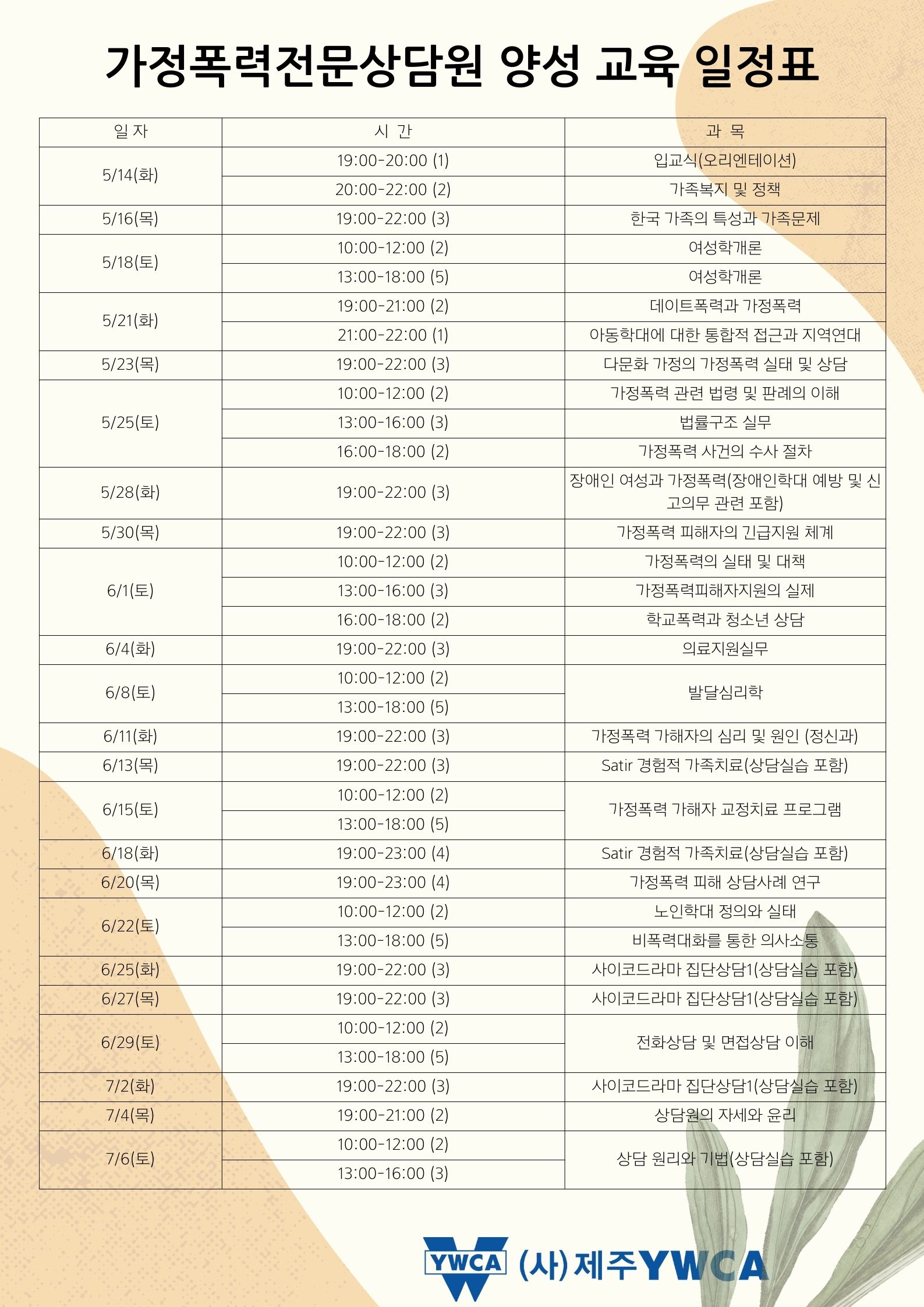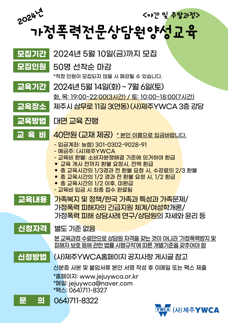 (사)제주YWCA 교육훈련원에서는 야간주말과정 대면교육으로 가정폭력 상담 지원을 위한 전문상담원 양성교육을 실시합니다.