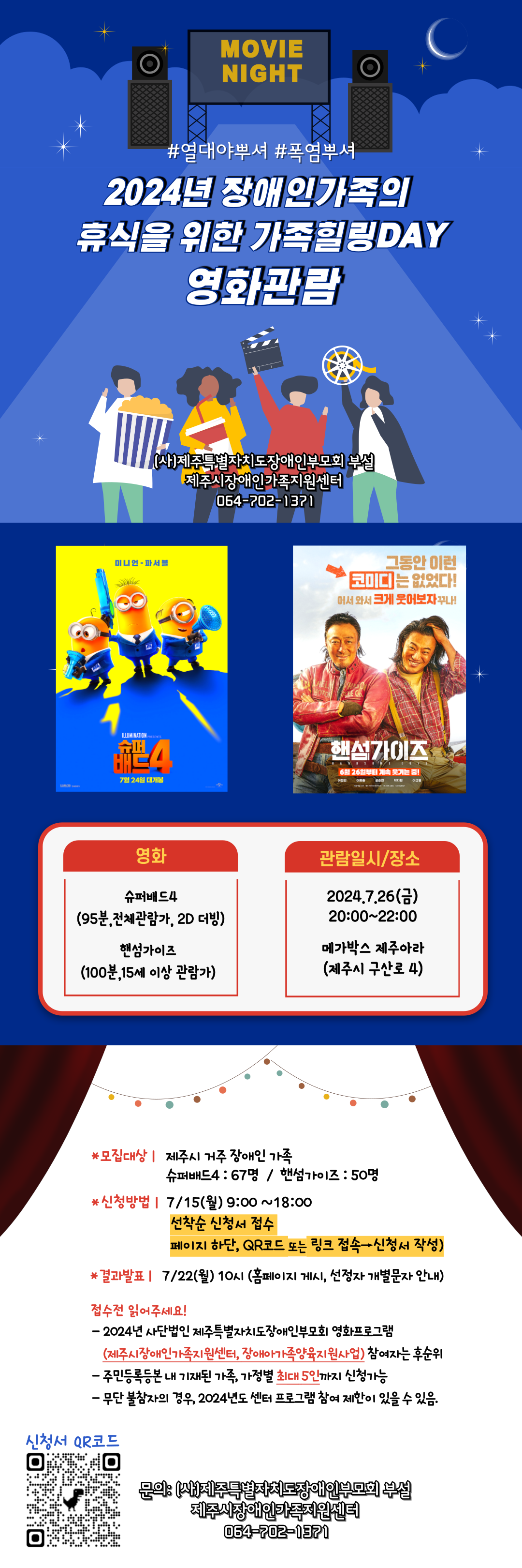 사단법인 제주특별자치도장애인부모회 부설 제주시장애인가족지원센터에서 가족영화관람 참여자를 모집하오니, 많은 관심과 신청부탁드립니다.