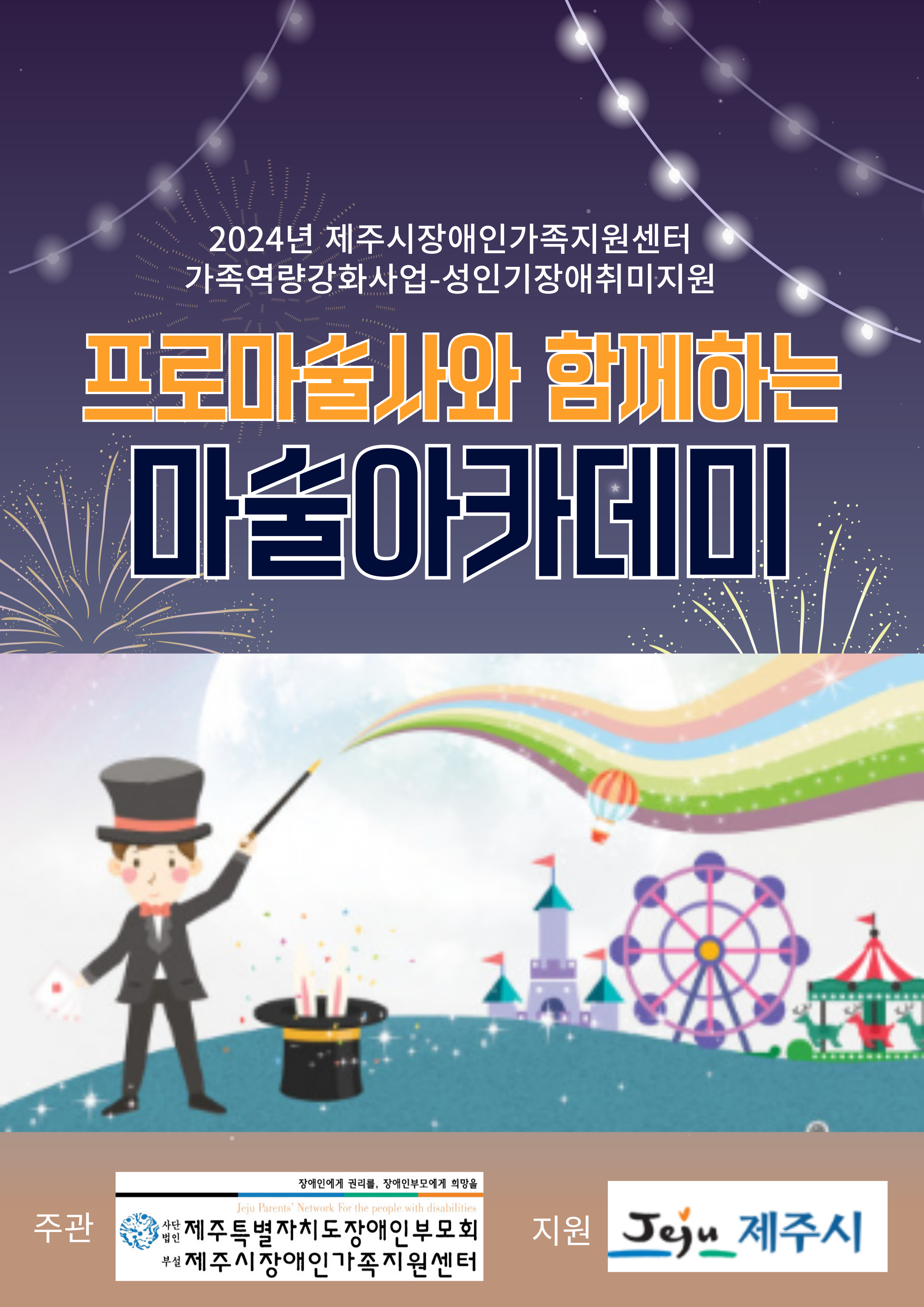 성인기장애인 취미지원사업 마술프로그램에 참여하는 과정에서 과학에 대한 이해를 높이고 마술을 연습함으로써 집중력과 끈기를 배우고 더불어 직접 무대 위에서 펼치는 마술 공연을 통해 자신감과 자존감을 올릴 수 있고 마술을 통해 도전과 희망을 줄 수 있습니다. 많은참여 부탁드립니다.