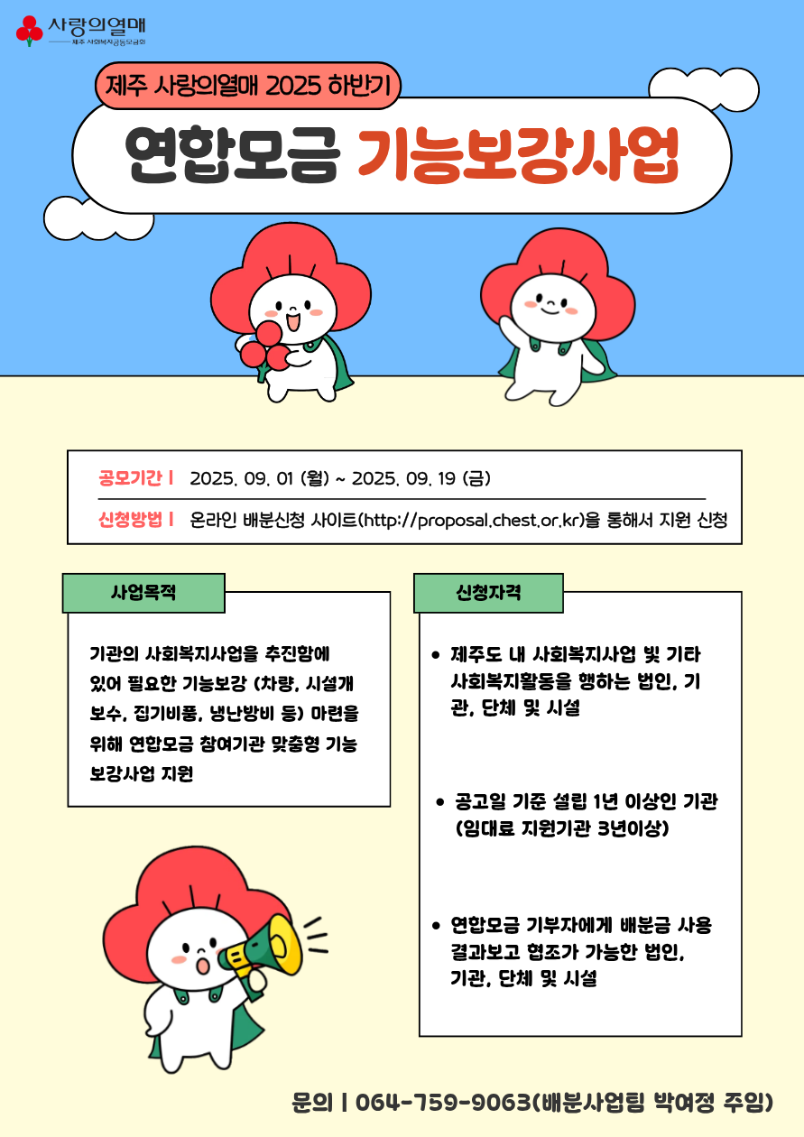안녕하세요. 제주사랑의열매에서 2025년 하반기 연합모금 기능보강사업 공모를 시행하오니