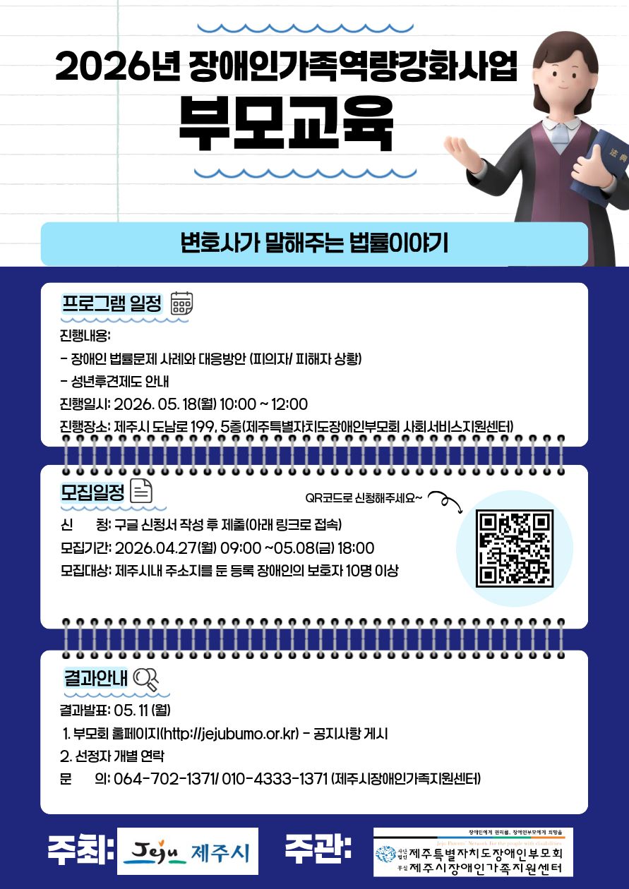 1. 프로그램 일정 진행내용 - 장애인 법률문제 사례와 대응방안 (피의자/ 피해자 상황) - 성년후견제도 안내 진행일시: 2026. 05. 18.(월) 10:00 ~ 12:00 진행장소: 제주시 도남로 199, 5층(제주특별자치도장애인부모회 사회서비스지원센터)
