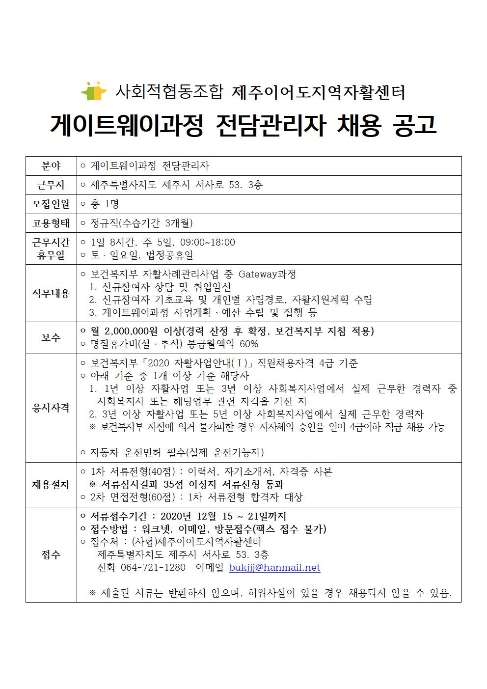 사회적협동조합 제주이어도지역자활센터 게이트웨이과정 전담관리자 채용 공고