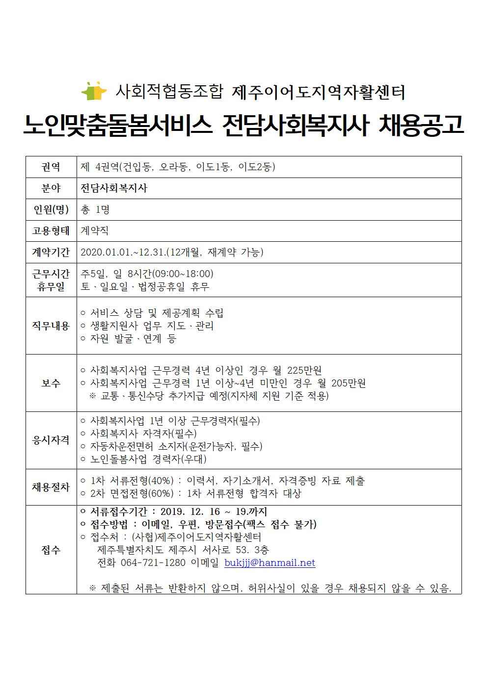 노인맞춤돌봄서비스 전담사회복지사 채용공고