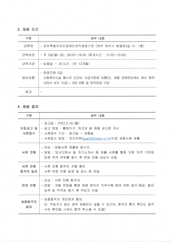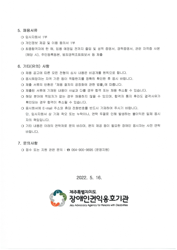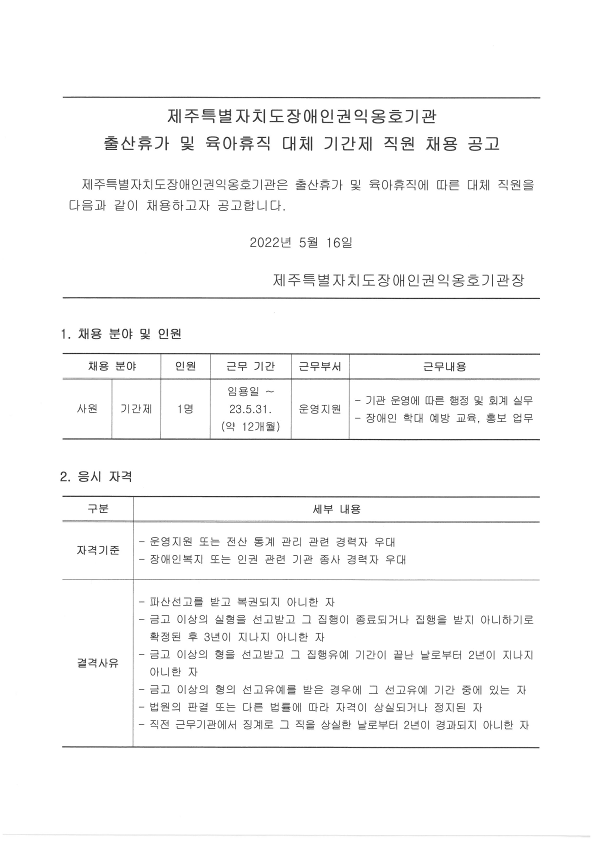 제주특별자치도장애인권익옹호기관 운영지원 직원 채용 공고