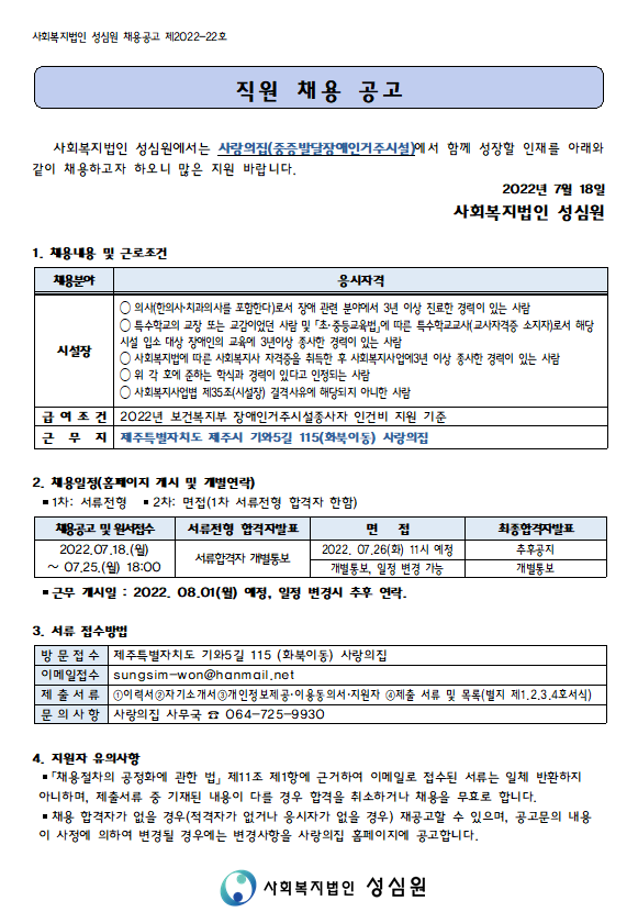 [사회복지법인 성심원 채용공고 제2022-22호]