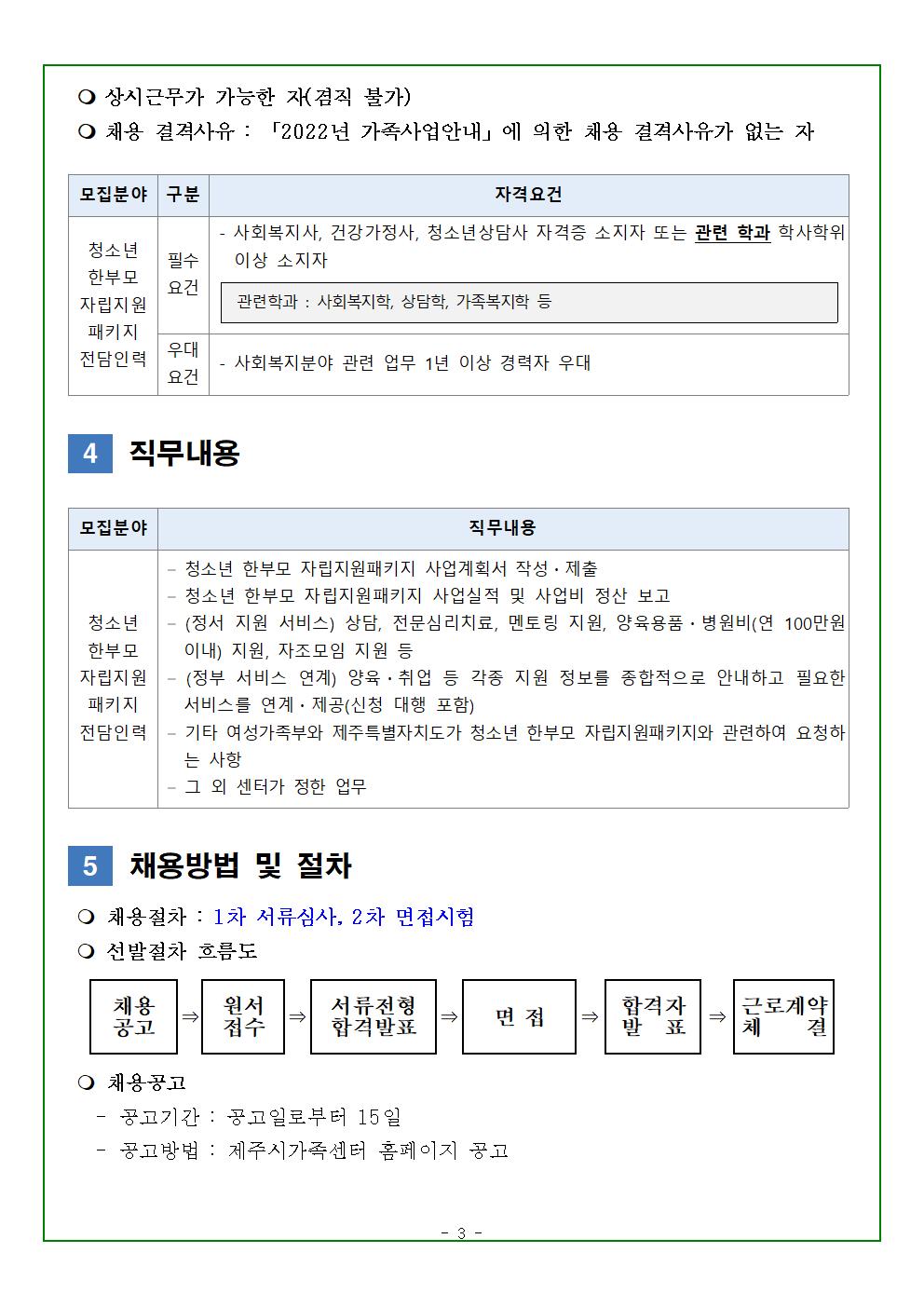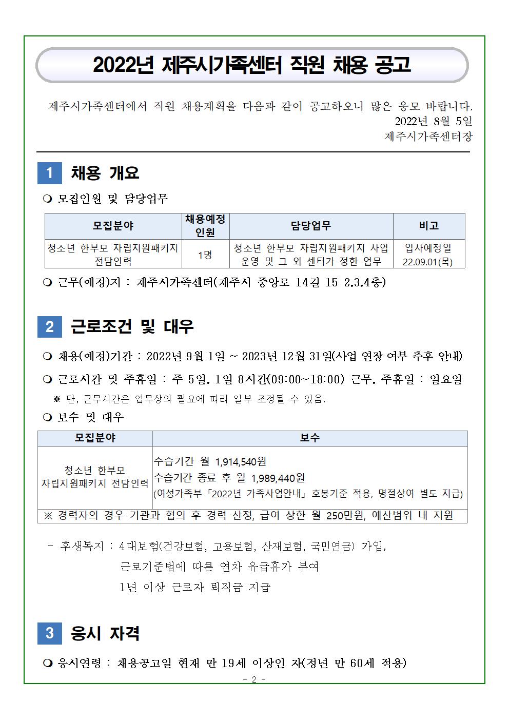 제주시가족센터 직원채용공고(청소년 한부모 자립지원패키지 전담인력)