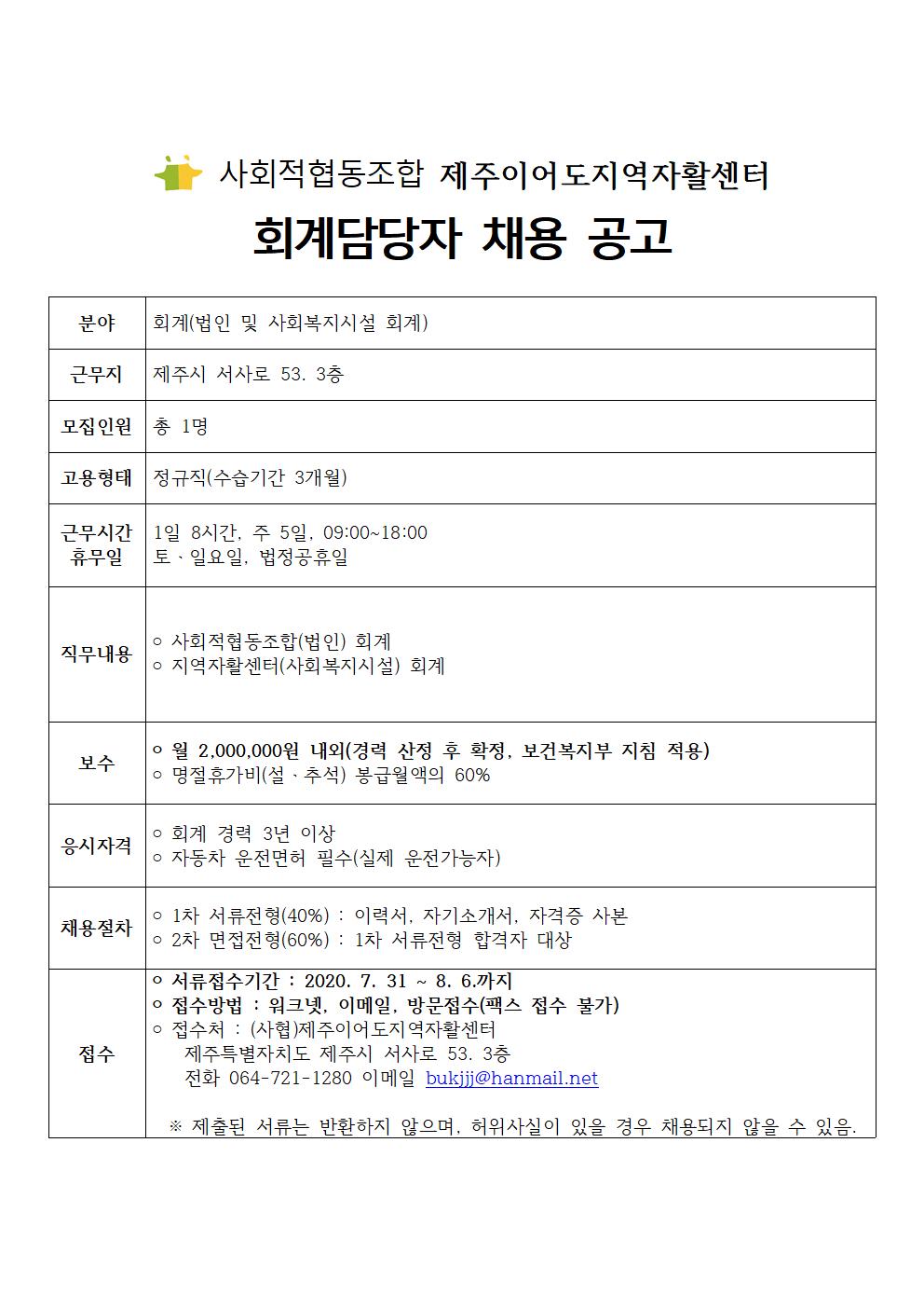 사회적협동조합 제주이어도지역자활센터 회계담당자 채용 공고