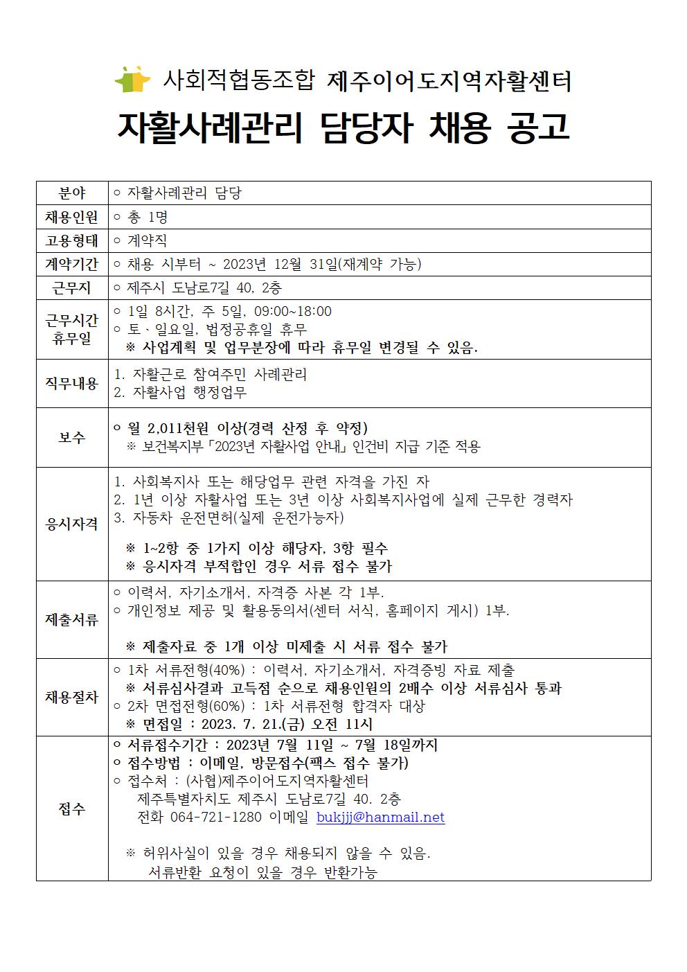 자활사례관리 담당자 채용공고