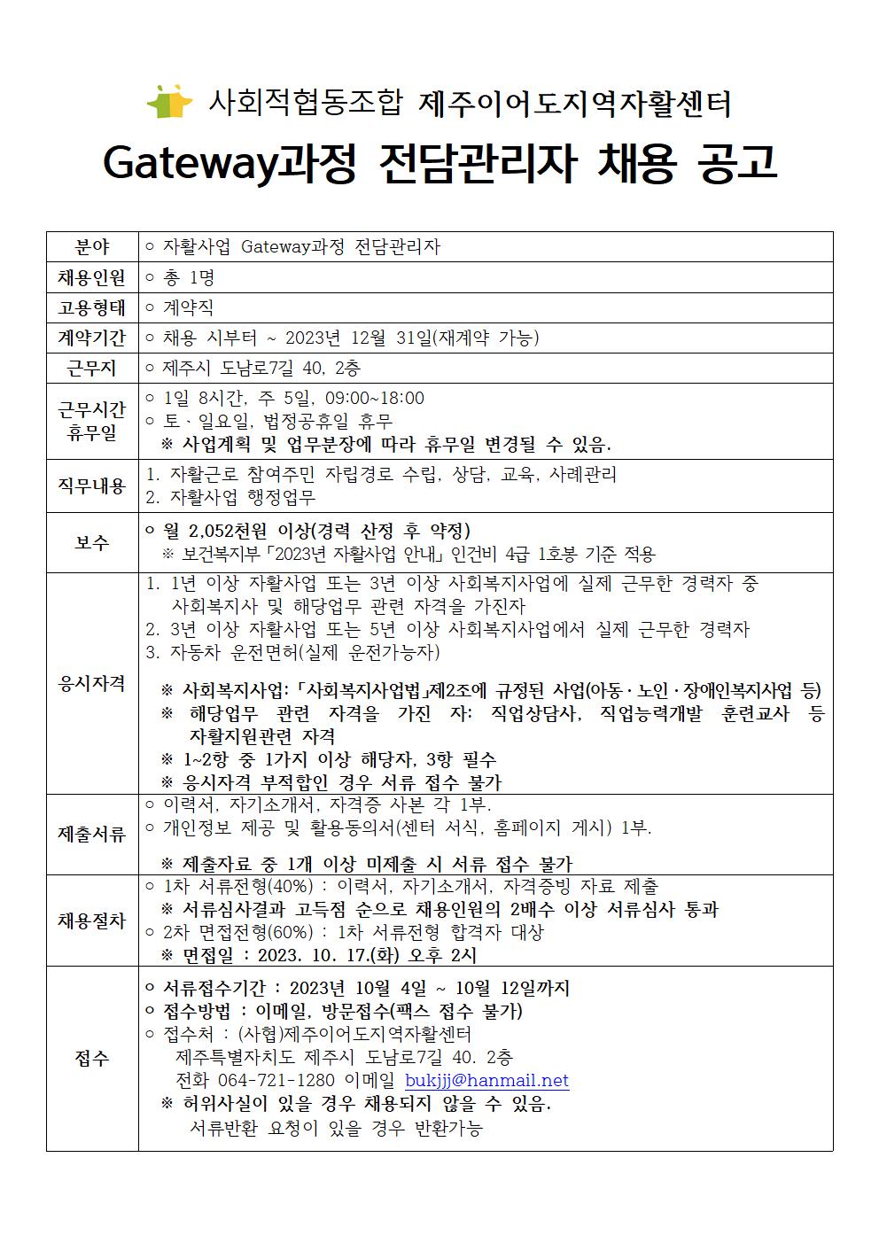 자활사업 Gateway과정 전담관리자를 채용합니다.