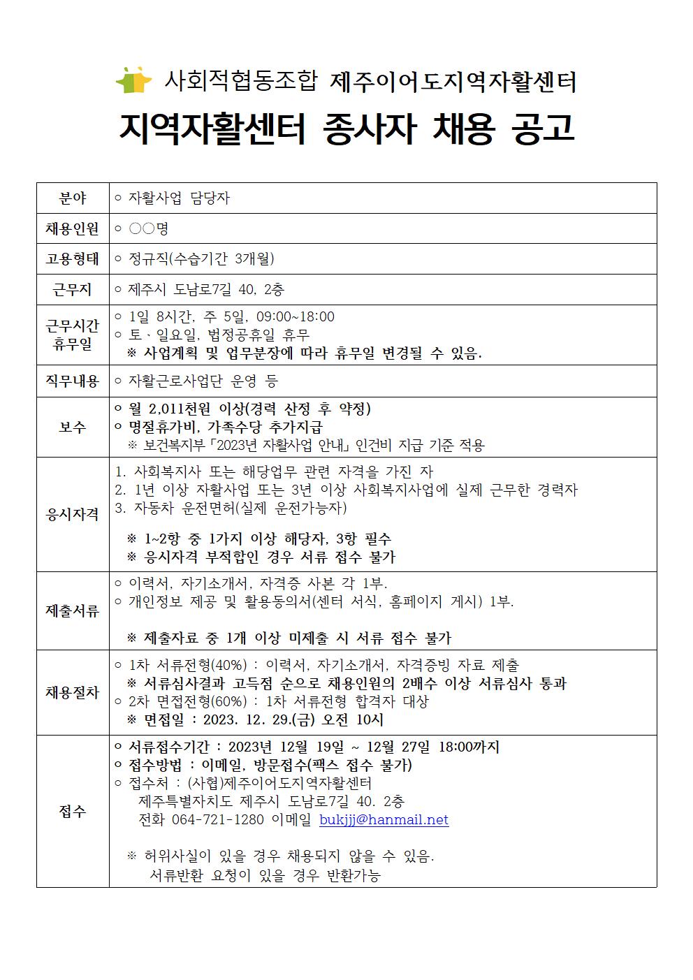 (사협)제주이어도지역자활센터 자활사업 담당자 채용공고(정규직)
