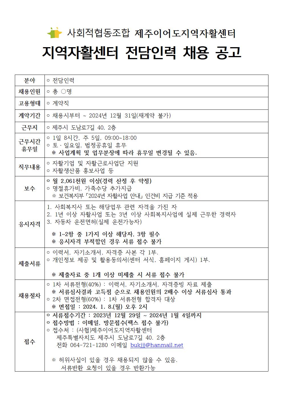 사회적협동조합 제주이어도지역자활센터 전담인력 채용 공고(긴급)