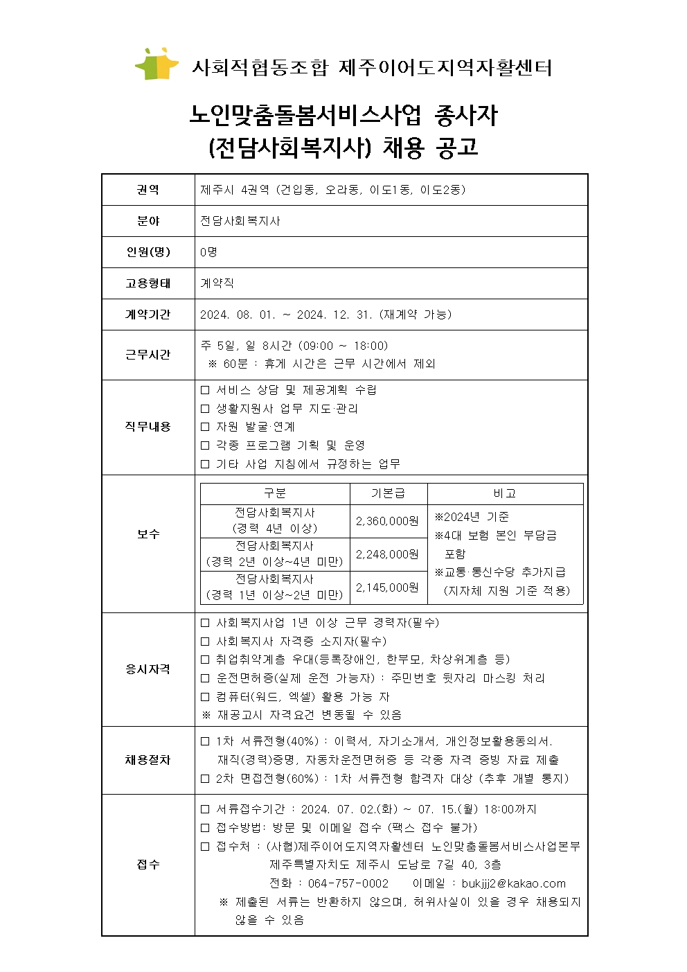 (사협)제주이어도지역자활센터 노인맞춤돌봄서비스사업 전담사회복지사 채용 공고