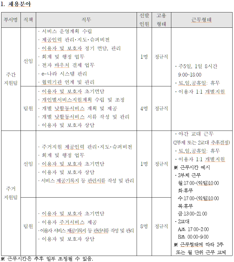 사회적협동조합 ‘나야’에서는 발달장애인 통합돌봄서비스에 열정과 관심을 가진 직원을 다음과 같이 모집합니다. 발달장애인 서비스 지원 경험과 역량 있는 분들의 많은 지원 바랍니다.