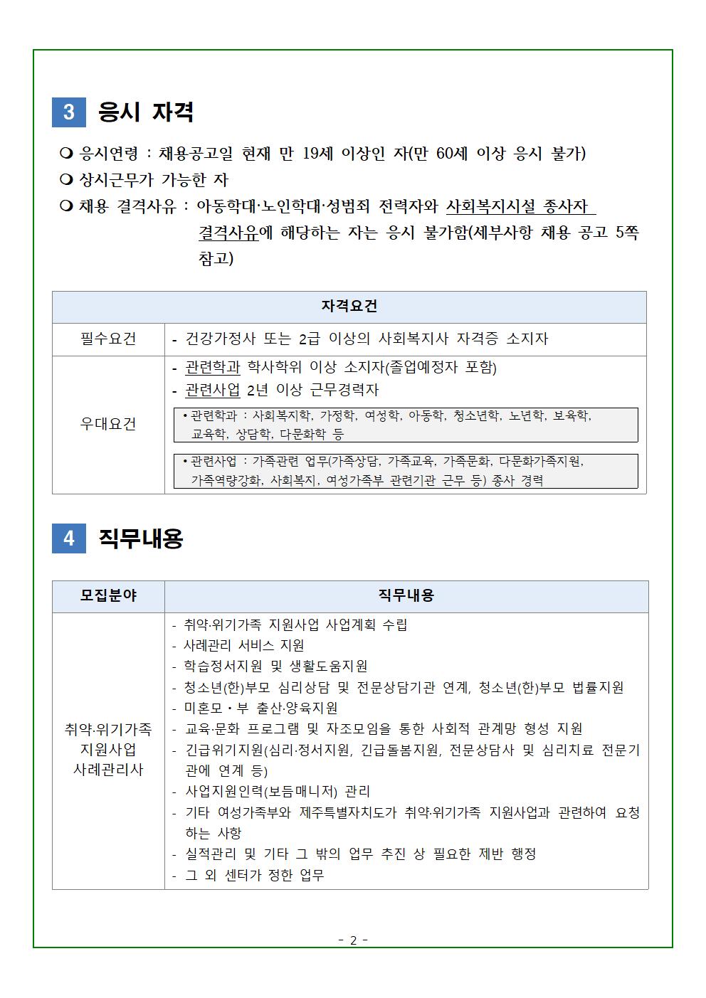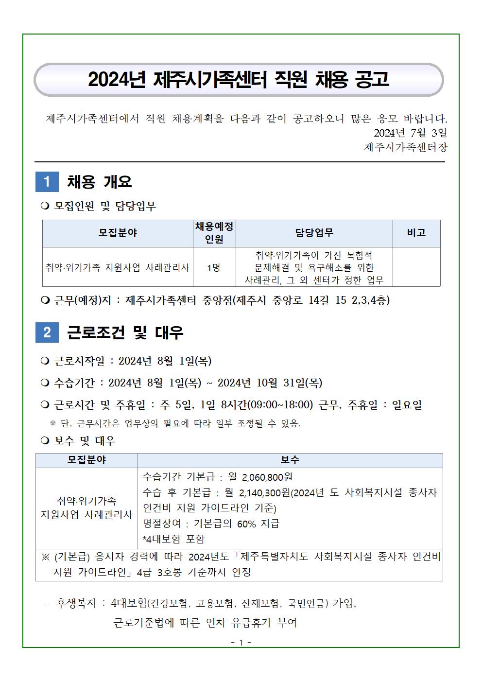 제주시가족센터 직원 채용 공고(취약.위기가족 지원사업 사례관리사)