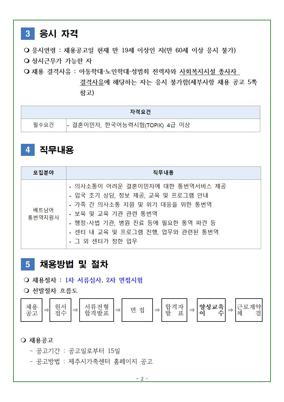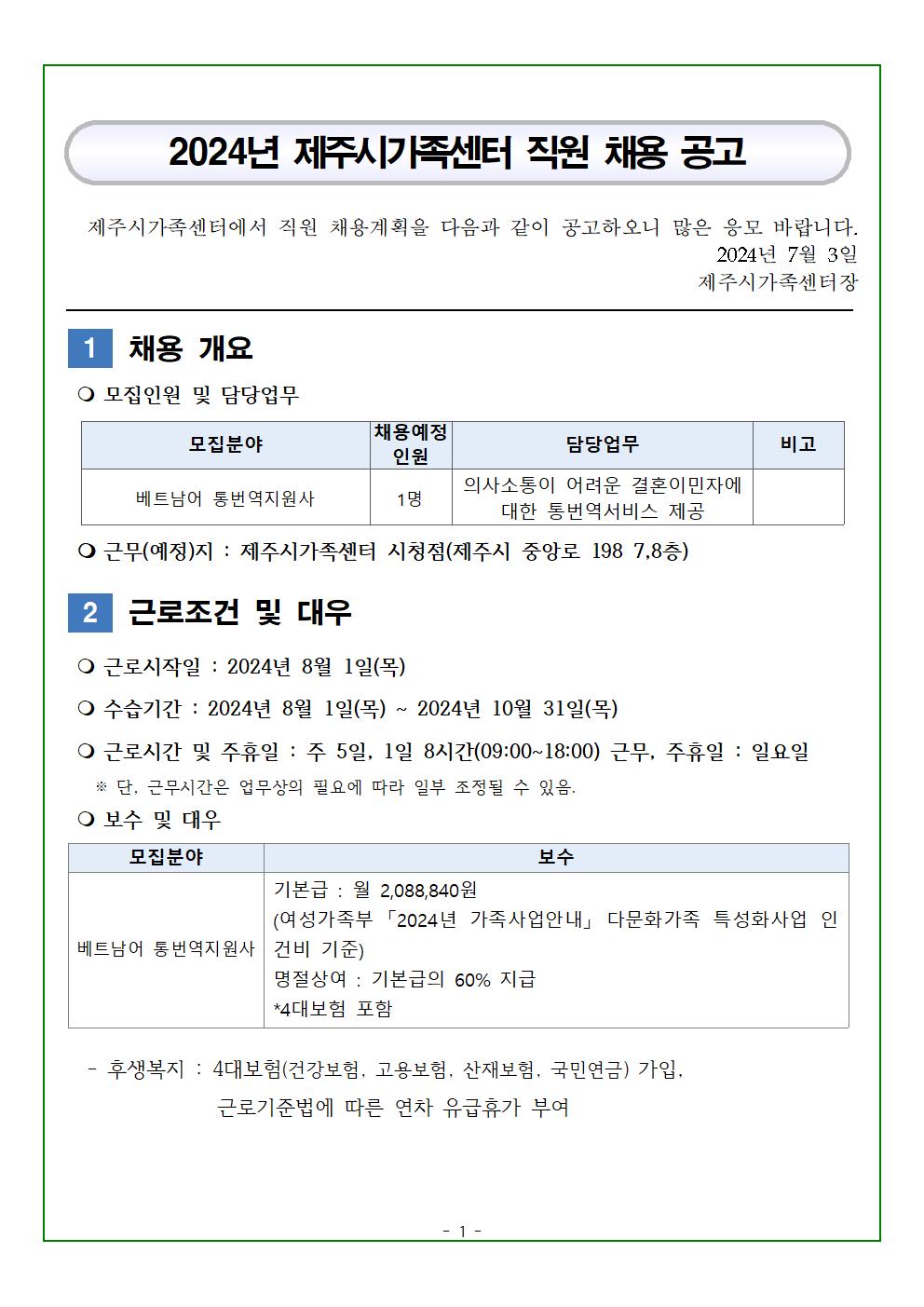 제주시가족센터 직원 채용 공고(베트남어 통번역지원사)