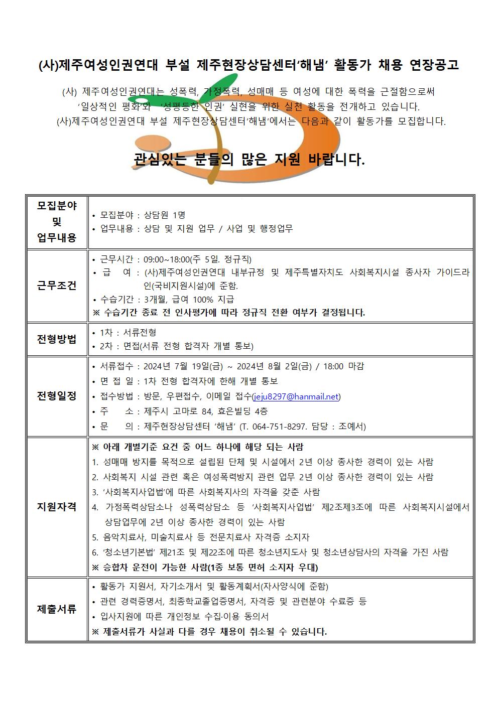 (사)제주여성인권연대 부설 제주현장상담센터‘해냄’ 활동가 채용 연장공고