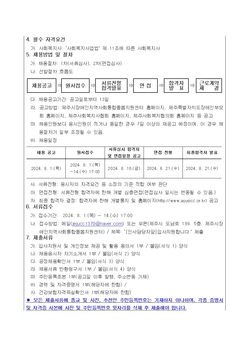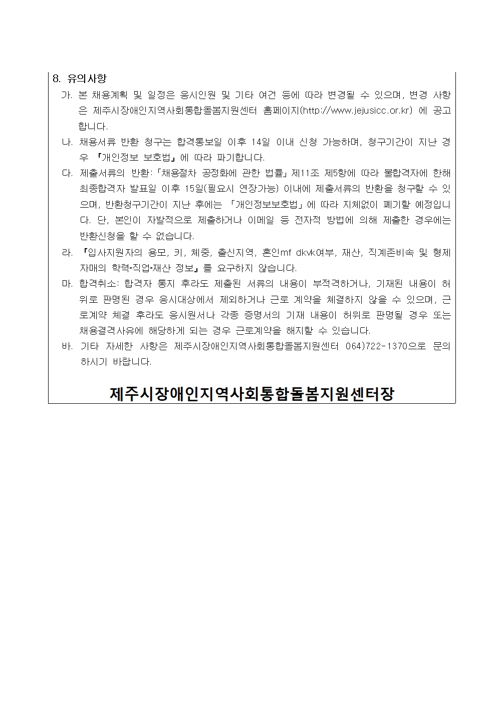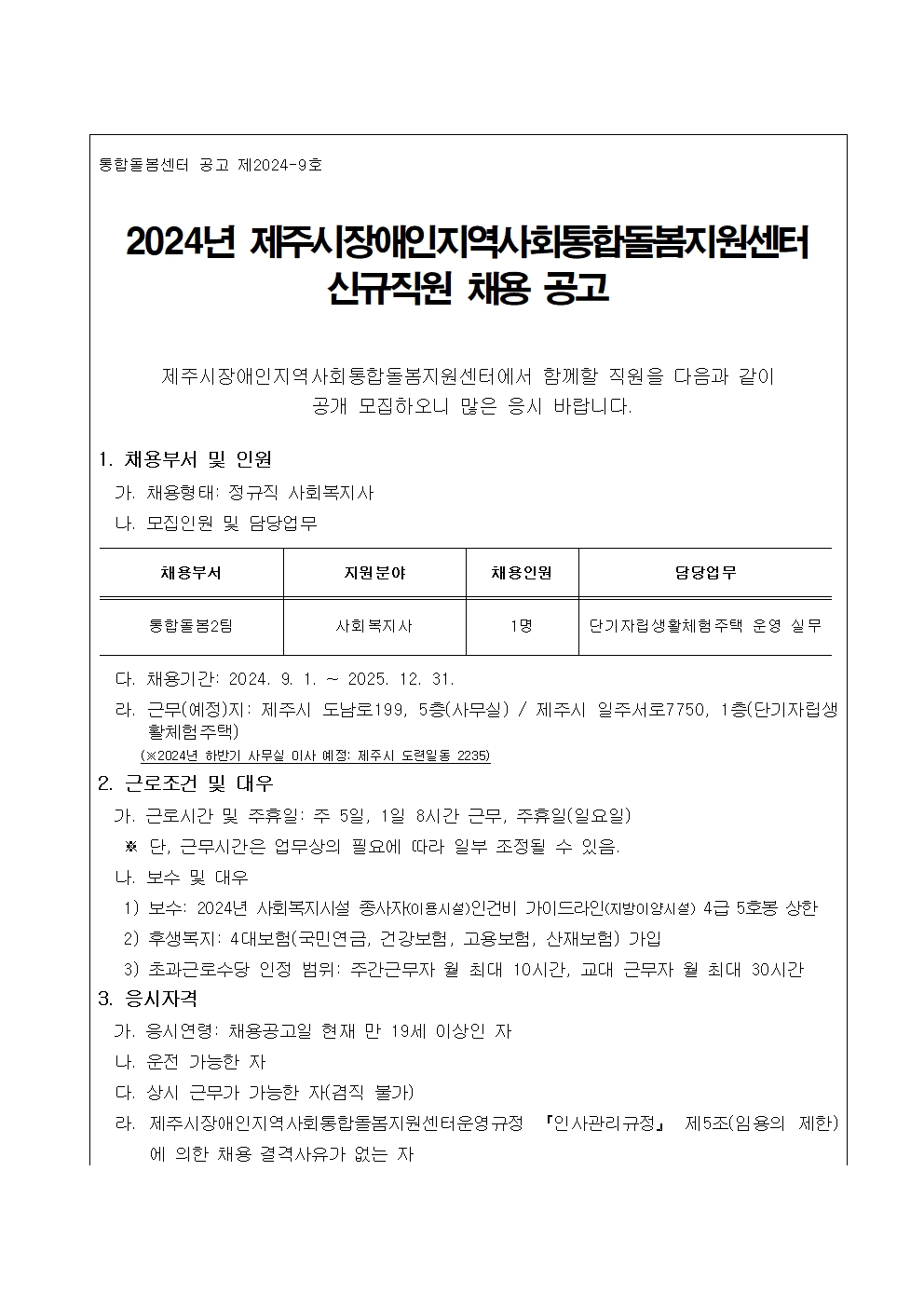 제주시장애인지역사회통합돌봄지원센터 신규직원 채용 공고