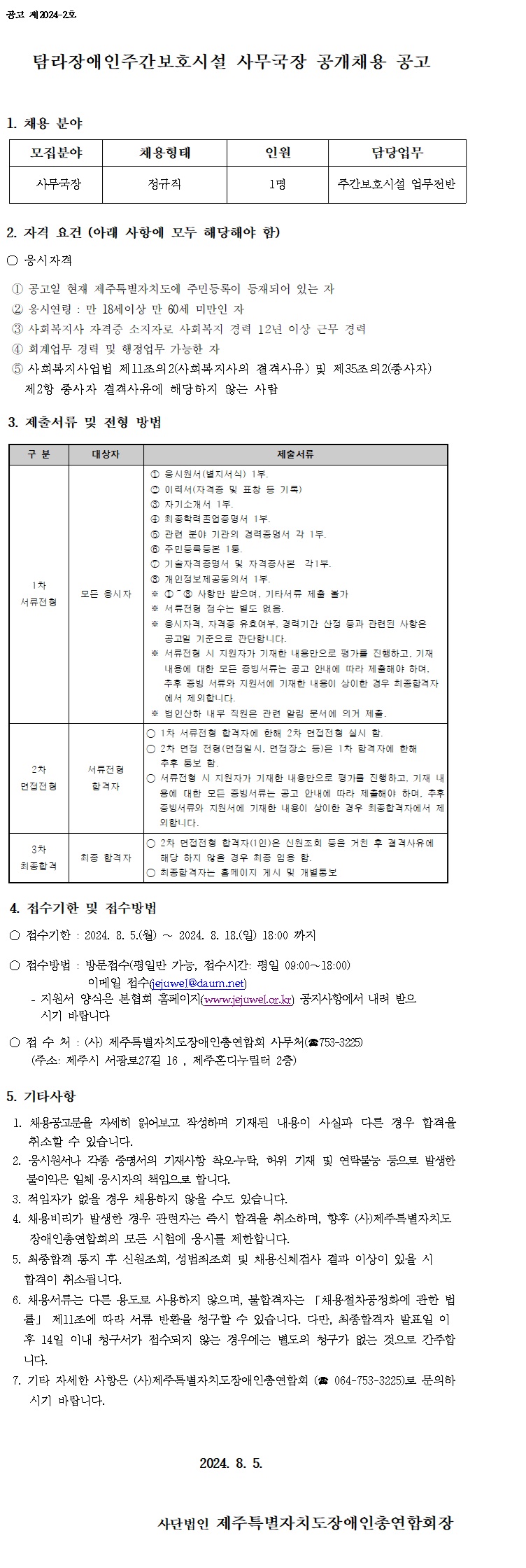 제주특별자치도장애인총연합회 탐라장애주간보호시설 사무국장 채용공고