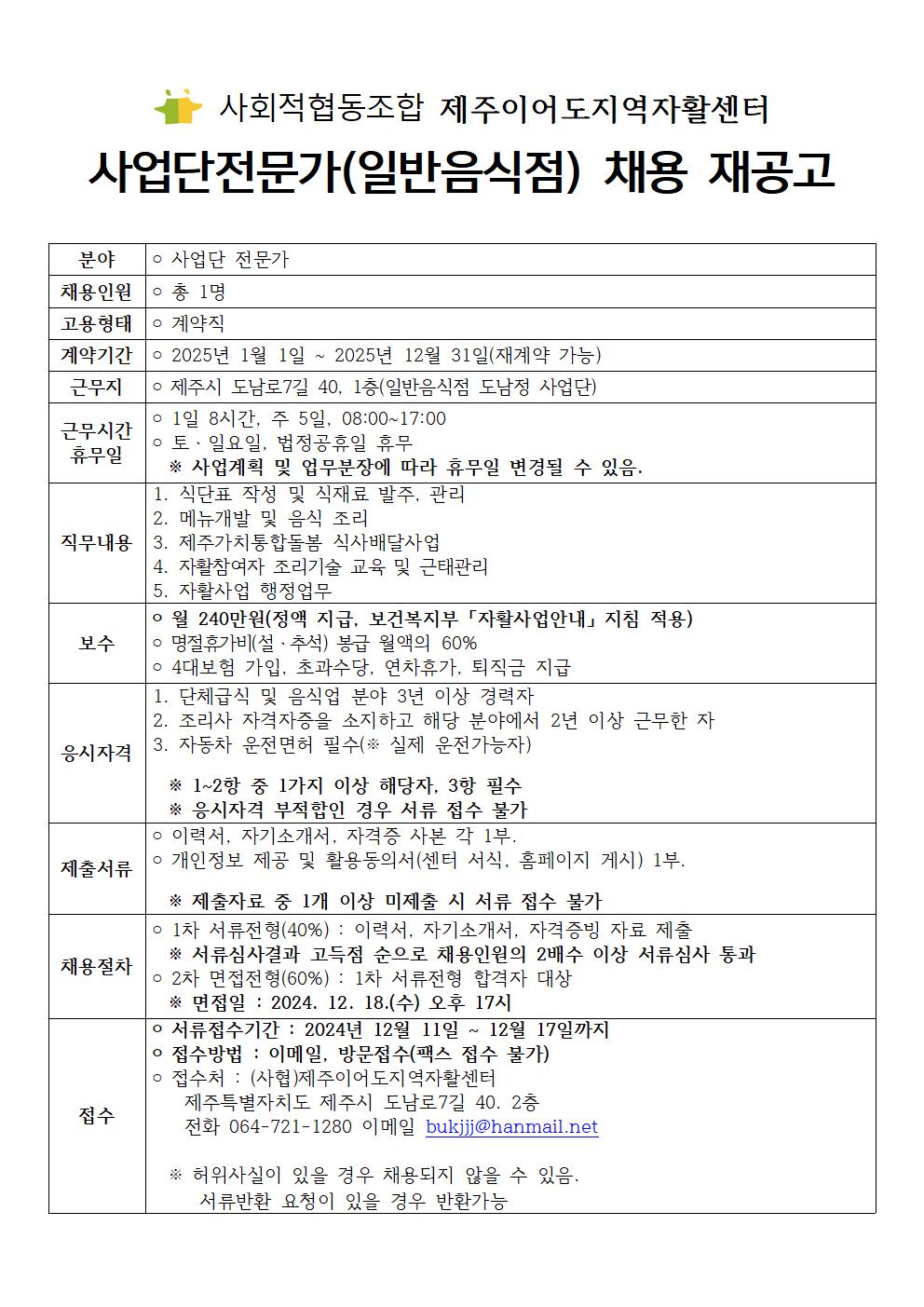 사회적협동조합 제주이어도지역자활센터에서 역량있는 사업단 전문가(일반음식점)를 채용합니다.