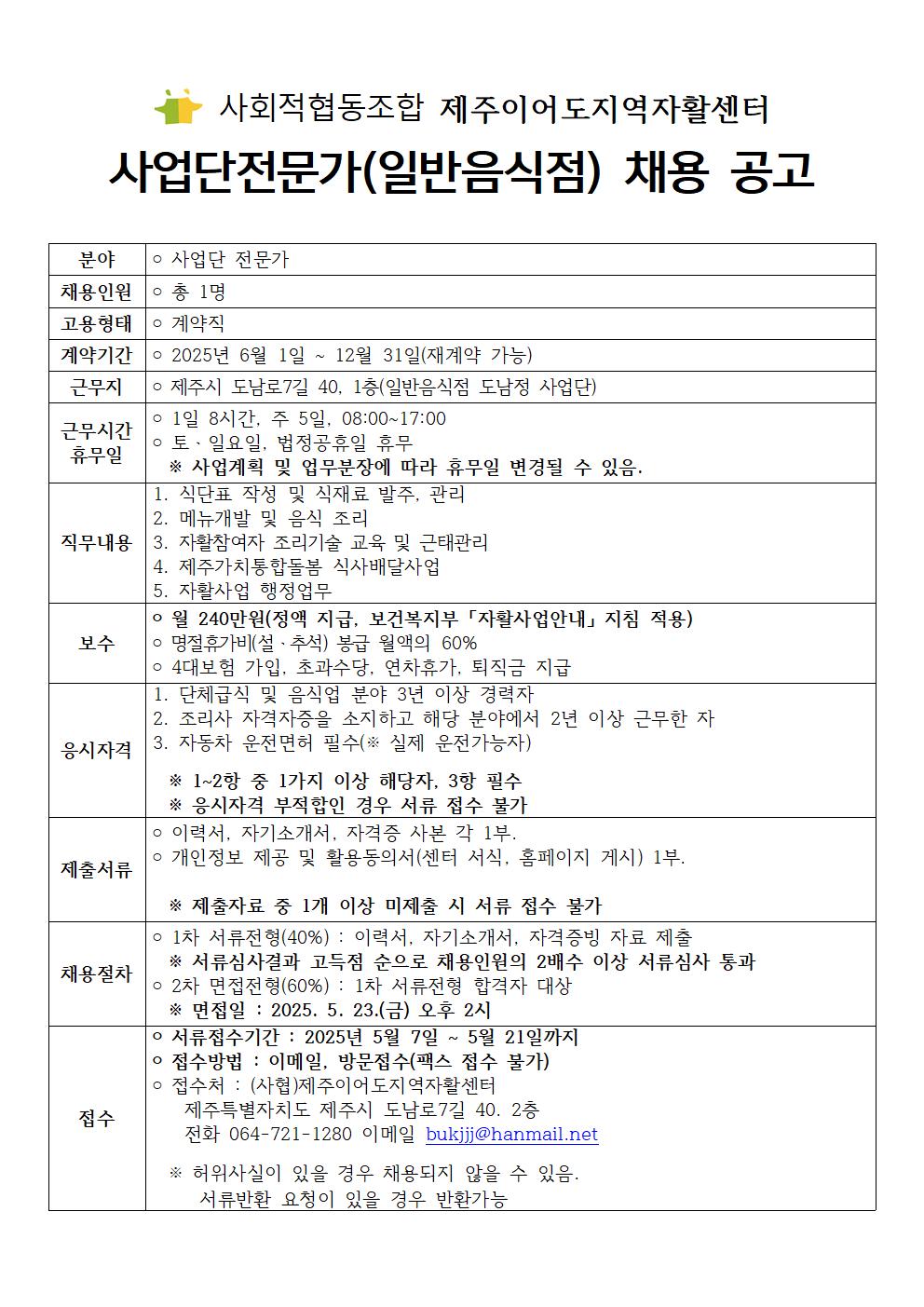 사회적협동조합 제주이어도지역자활센터 사업단전문가(일반음식점) 채용공고