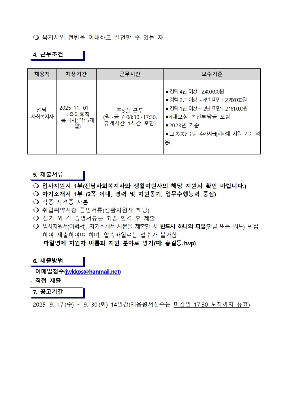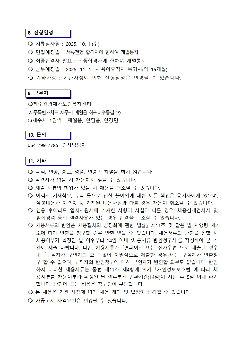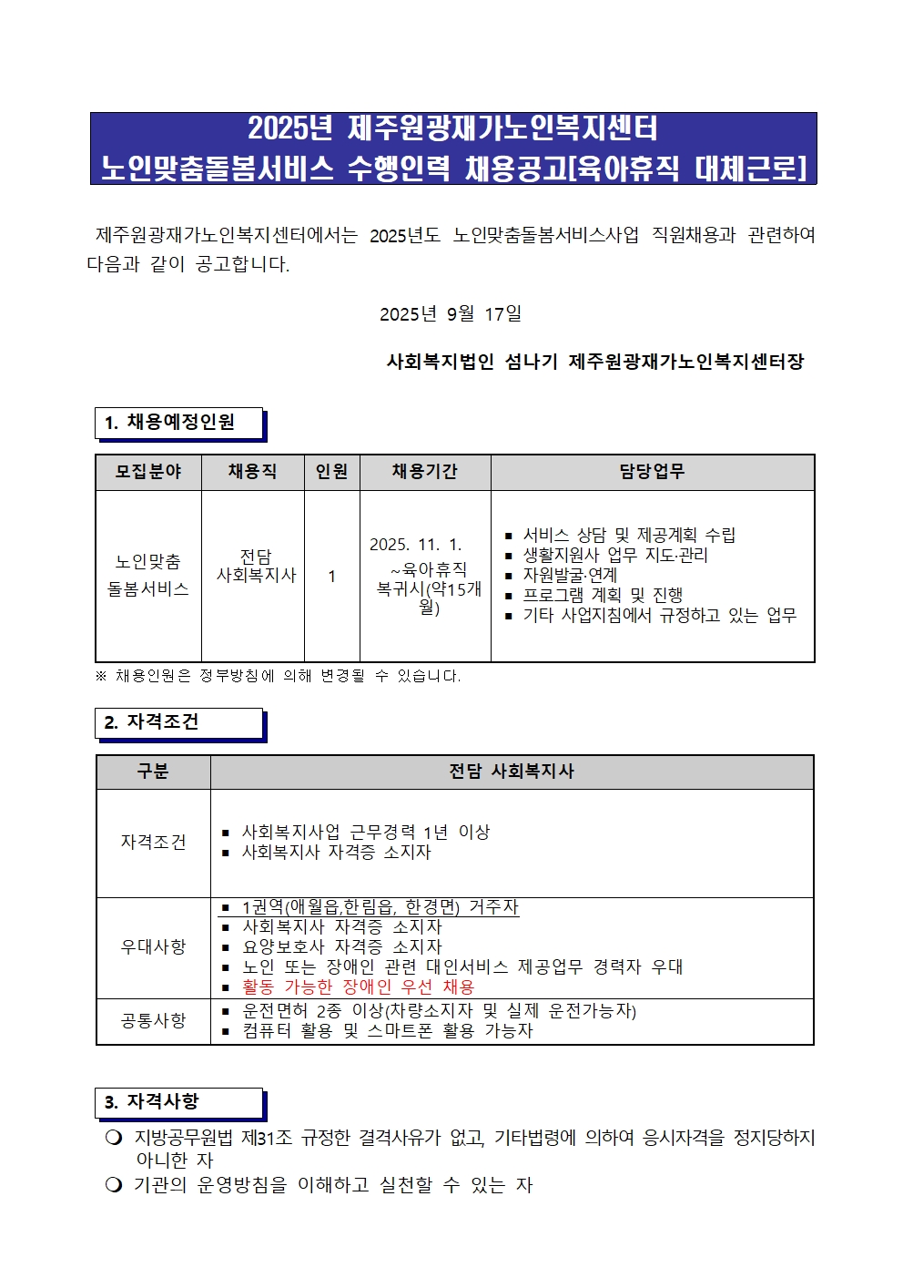 2025년 제주원광재가노인복지센터 노인맞춤돌봄서비스 수행인력 채용공고[육아휴직 대체근로]