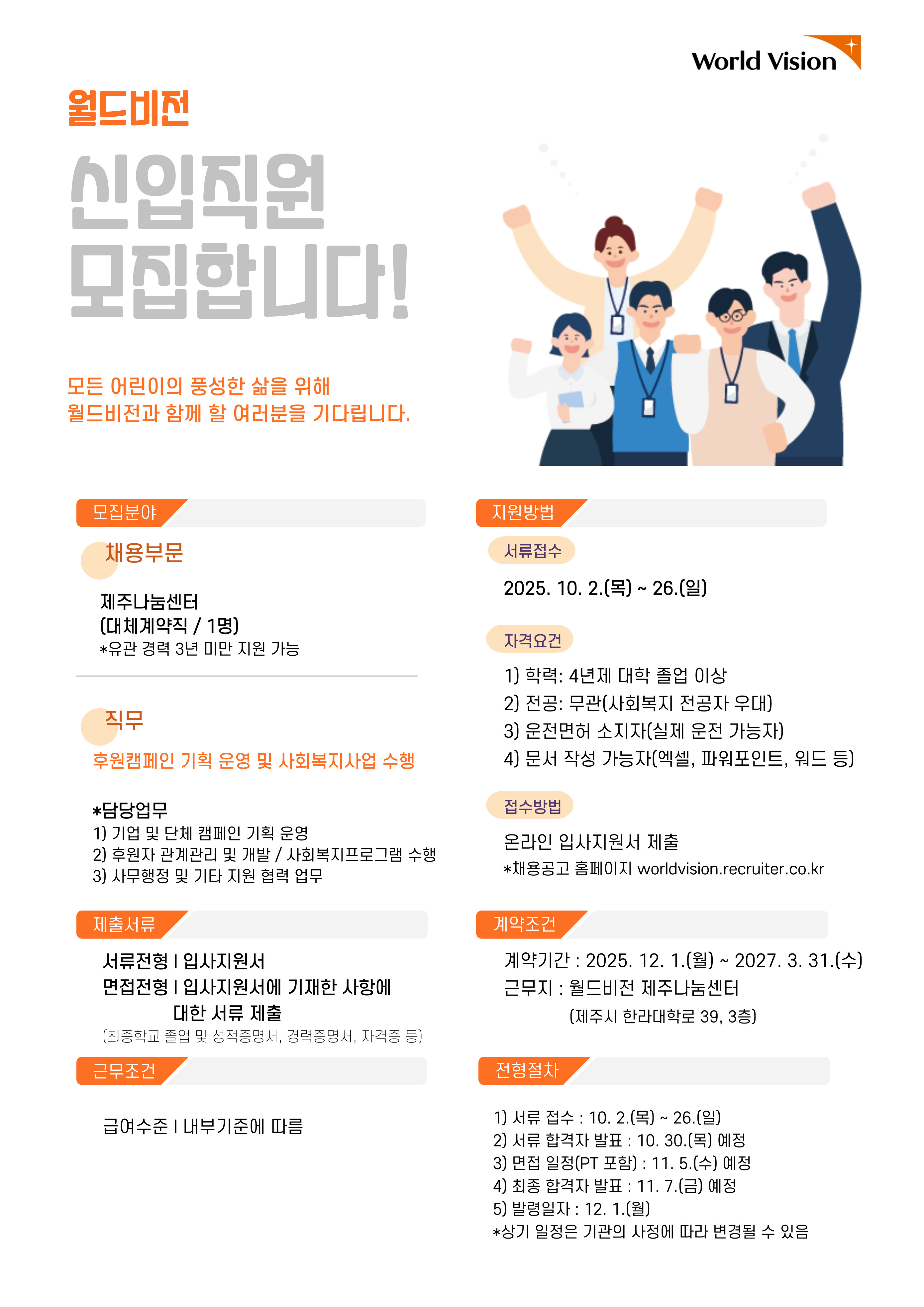 월드비전 제주나눔센터(후원캠페인 기획 운영 및 기관사업 담당/대체계약직/신입/1명)채용 공고