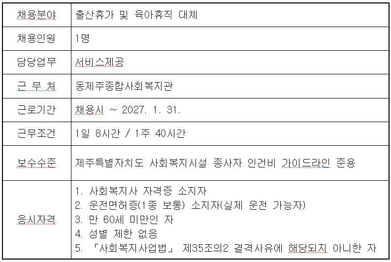동제주종합사회복지관에서는 함께 근무할 직원을 아래와 같이 모집합니다.