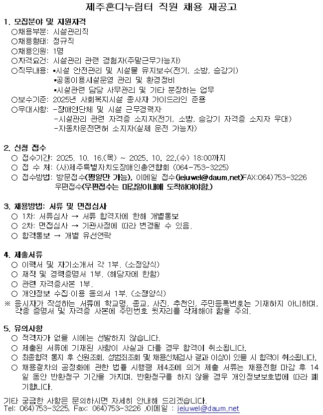 제주혼디누림터 직원 채용 재공고-시설관리직