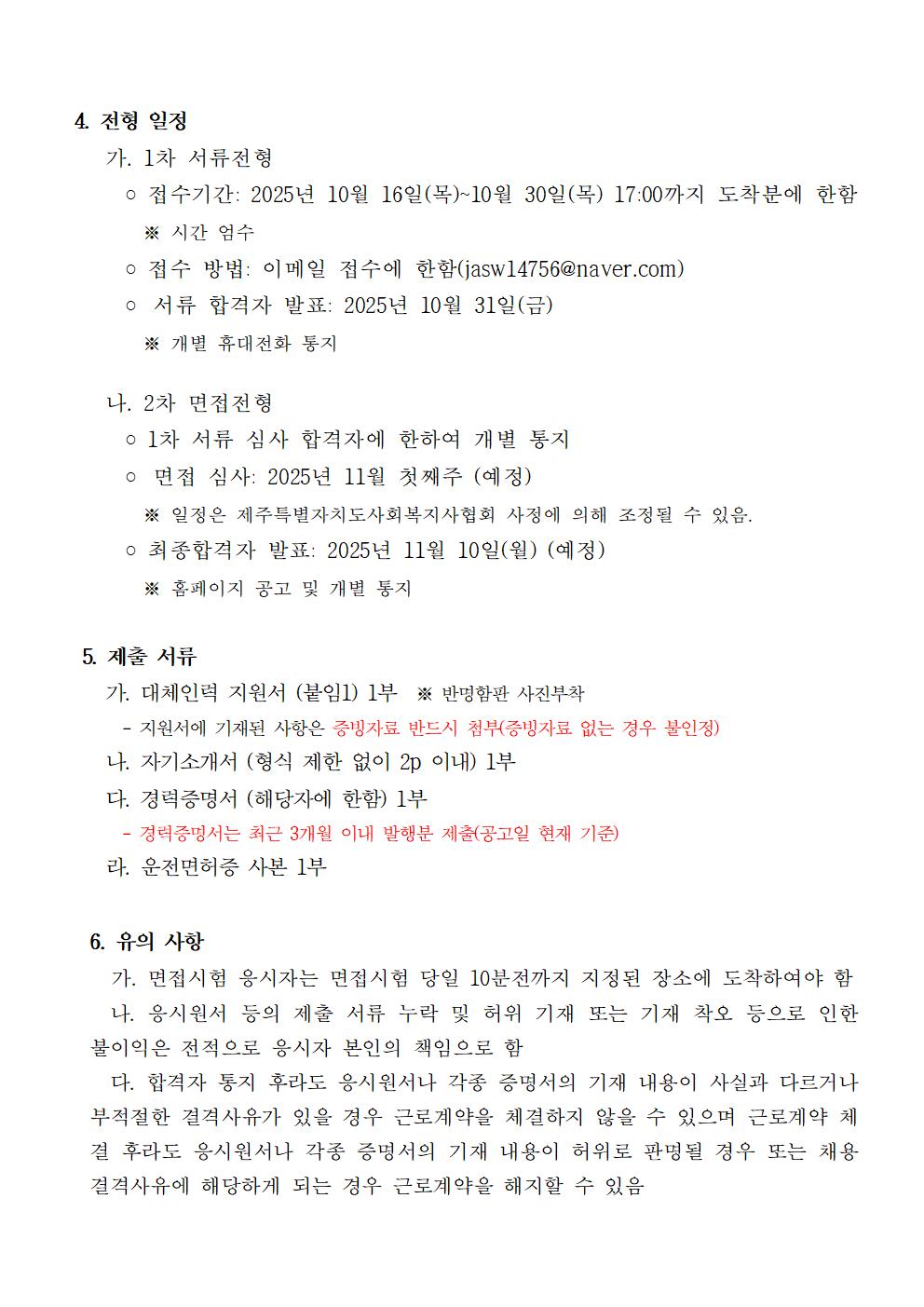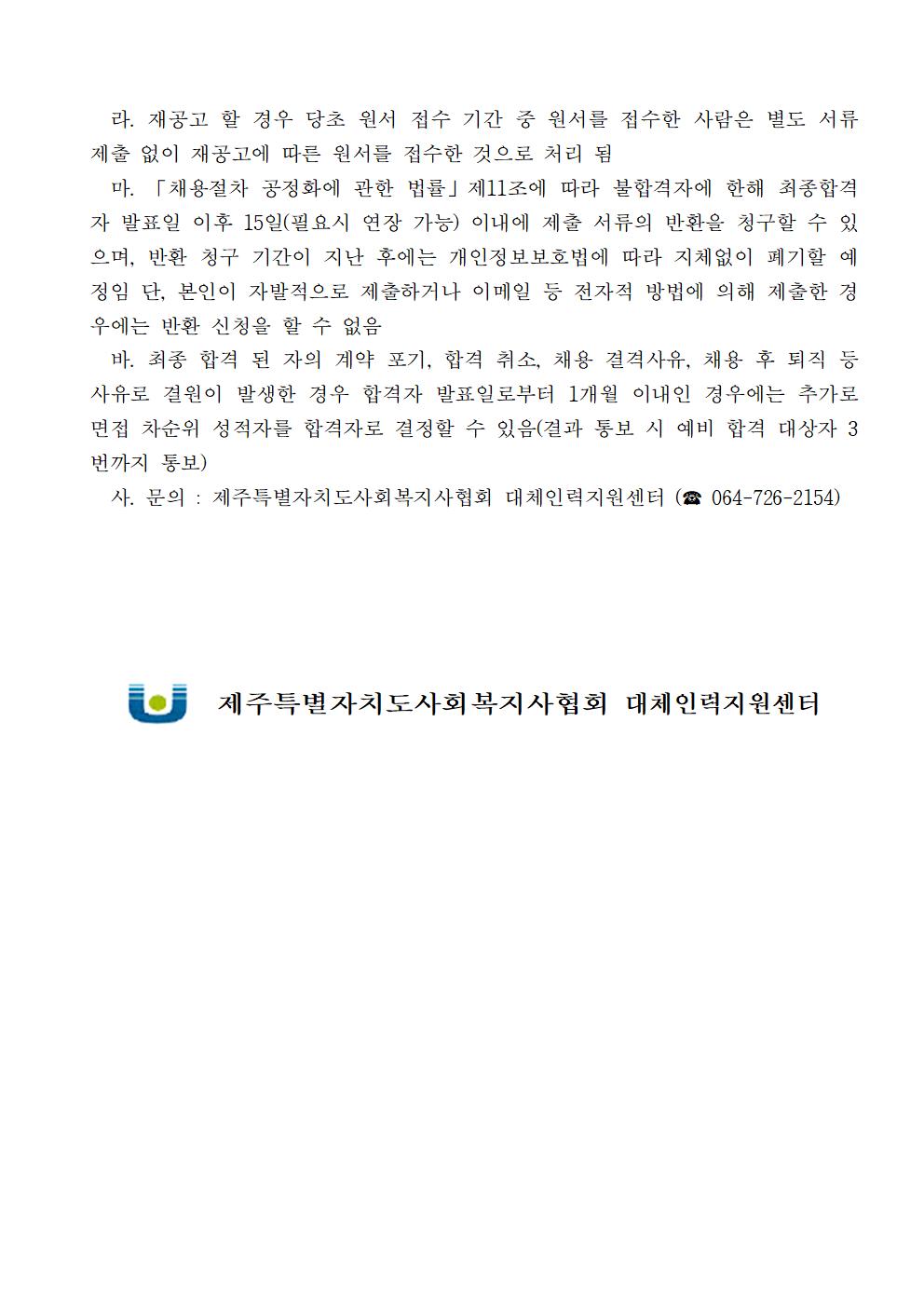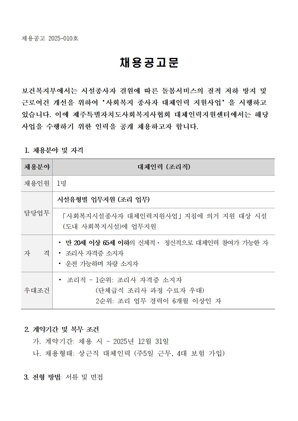 2025년 제7차 제주특별자치도사회복지사협회 대체인력지원센터 직원 채용 공고(조리직)
