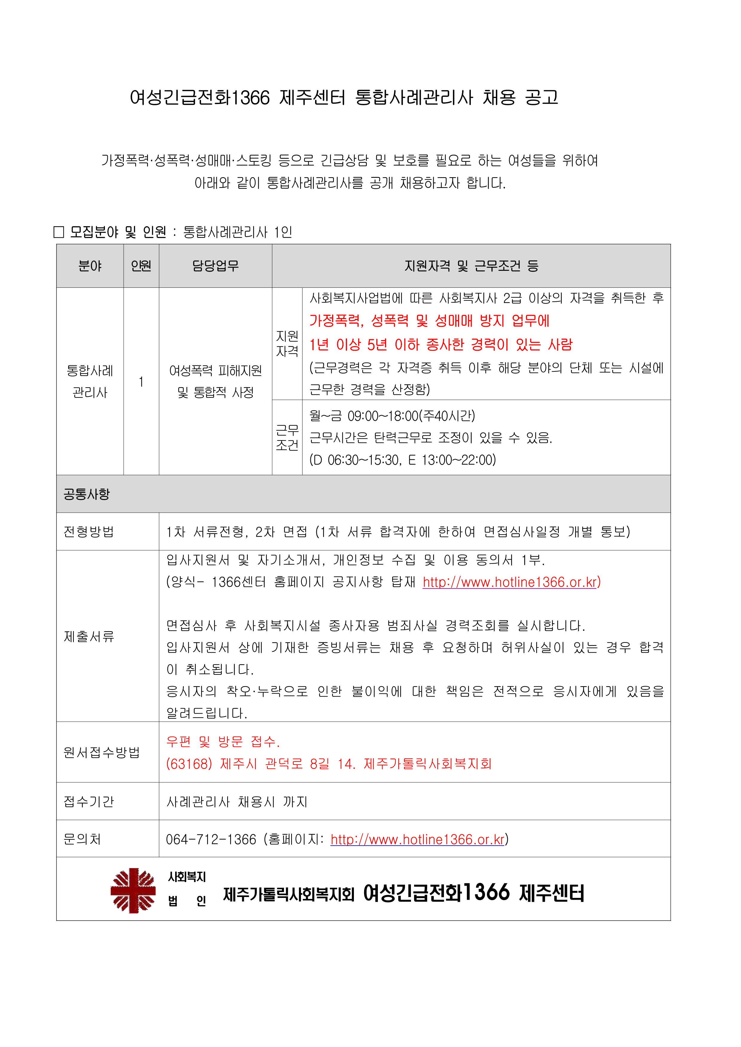 1366센터 통합사례관리사 공개채용 **경력1년이상 5년이하**