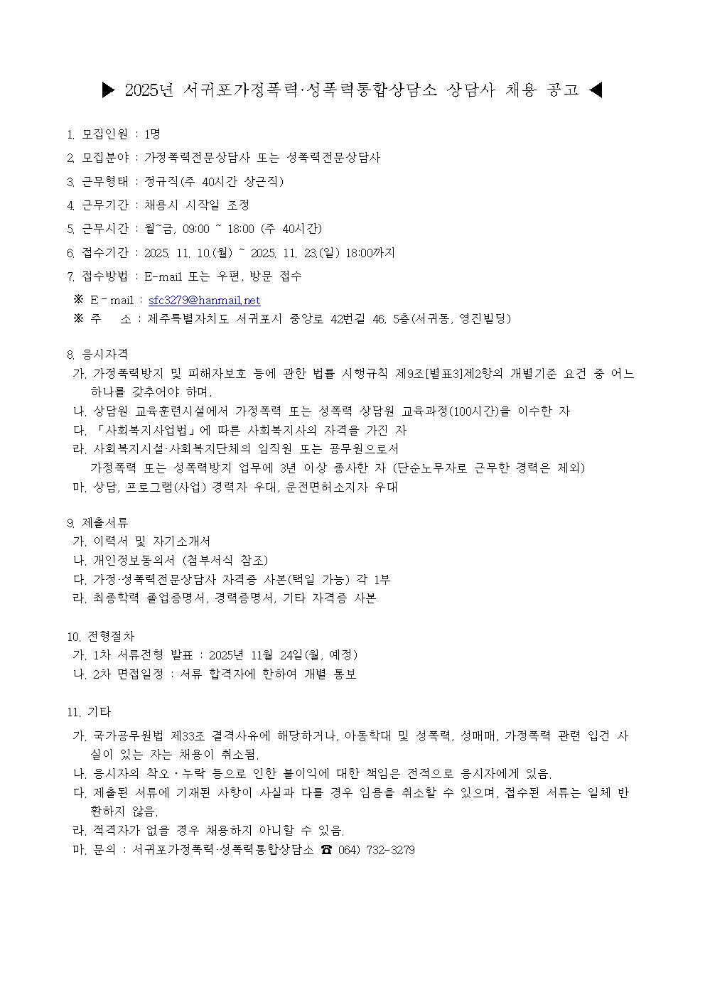 [재공고] 서귀포가정폭력·성폭력통합상담소 상담사 채용