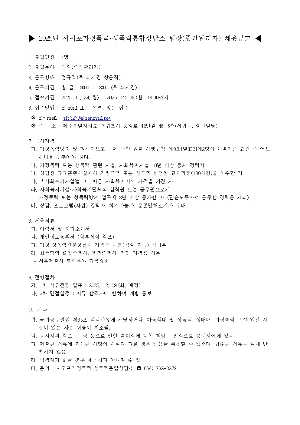 [공고] 서귀포가정폭력·성폭력통합상담소 팀장 채용