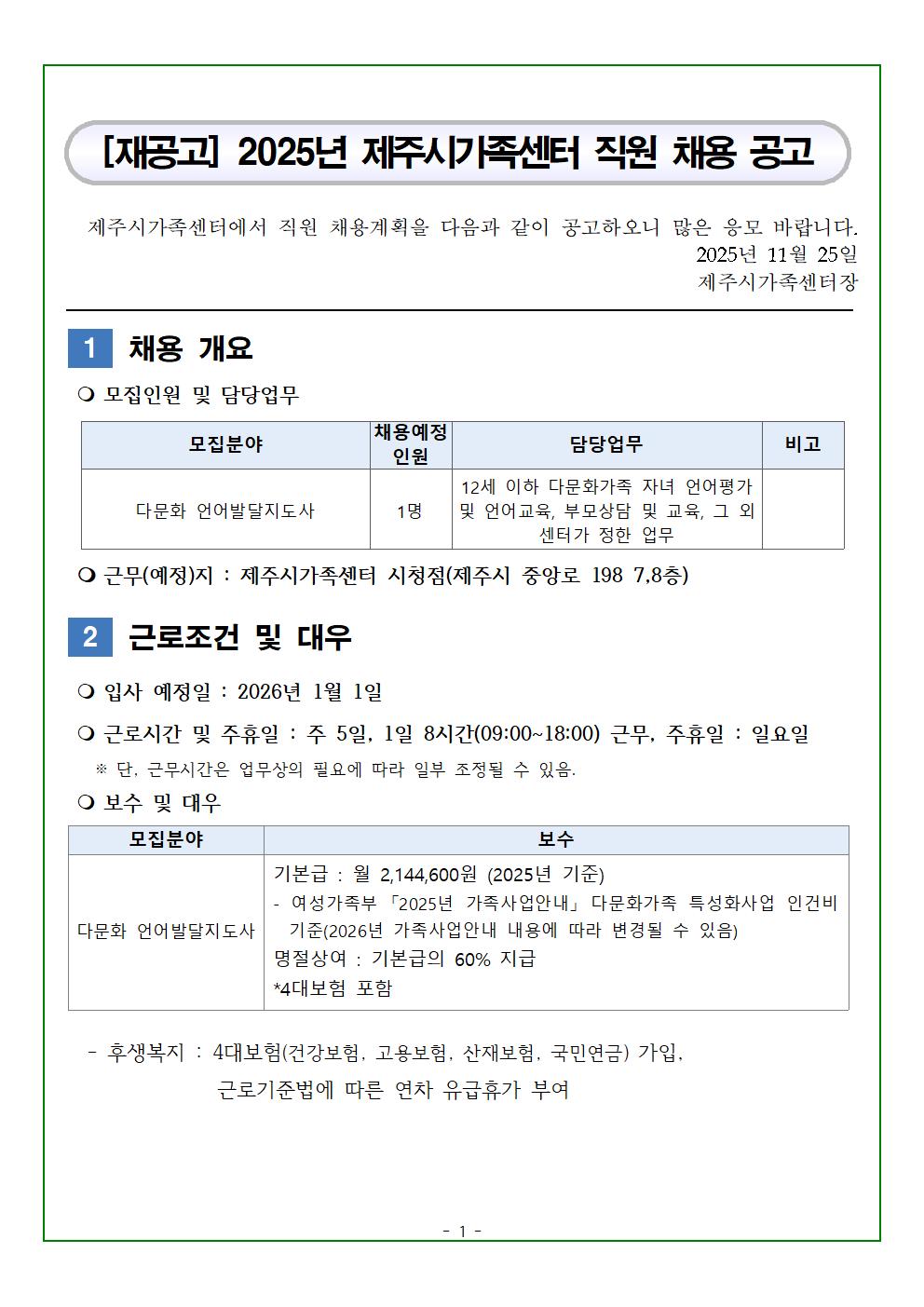 [재공고] 2025년 제주시가족센터 직원 채용 공고(다문화 언어발달지도사)