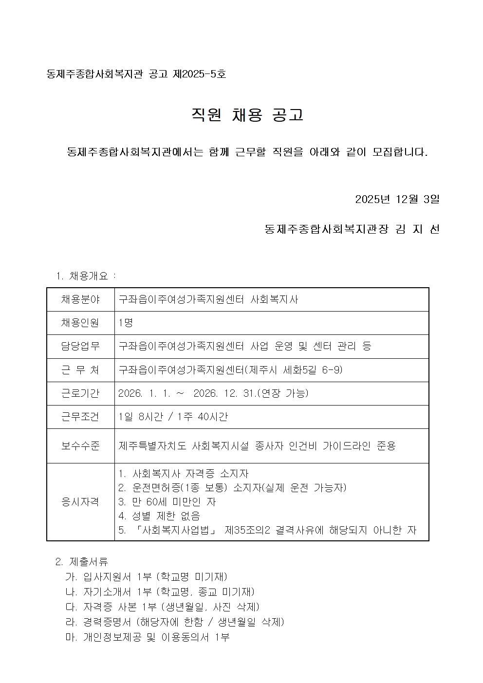 동제주종합사회복지관(구좌읍이주여성가족지원센터) 계약직 직원 채용 공고