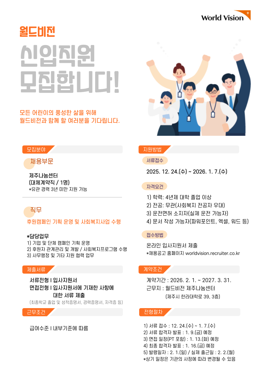월드비전 제주나눔센터(후원캠페인 기획 운영 및 기관사업 담당/대체계약직/신입/1명)채용 공고
