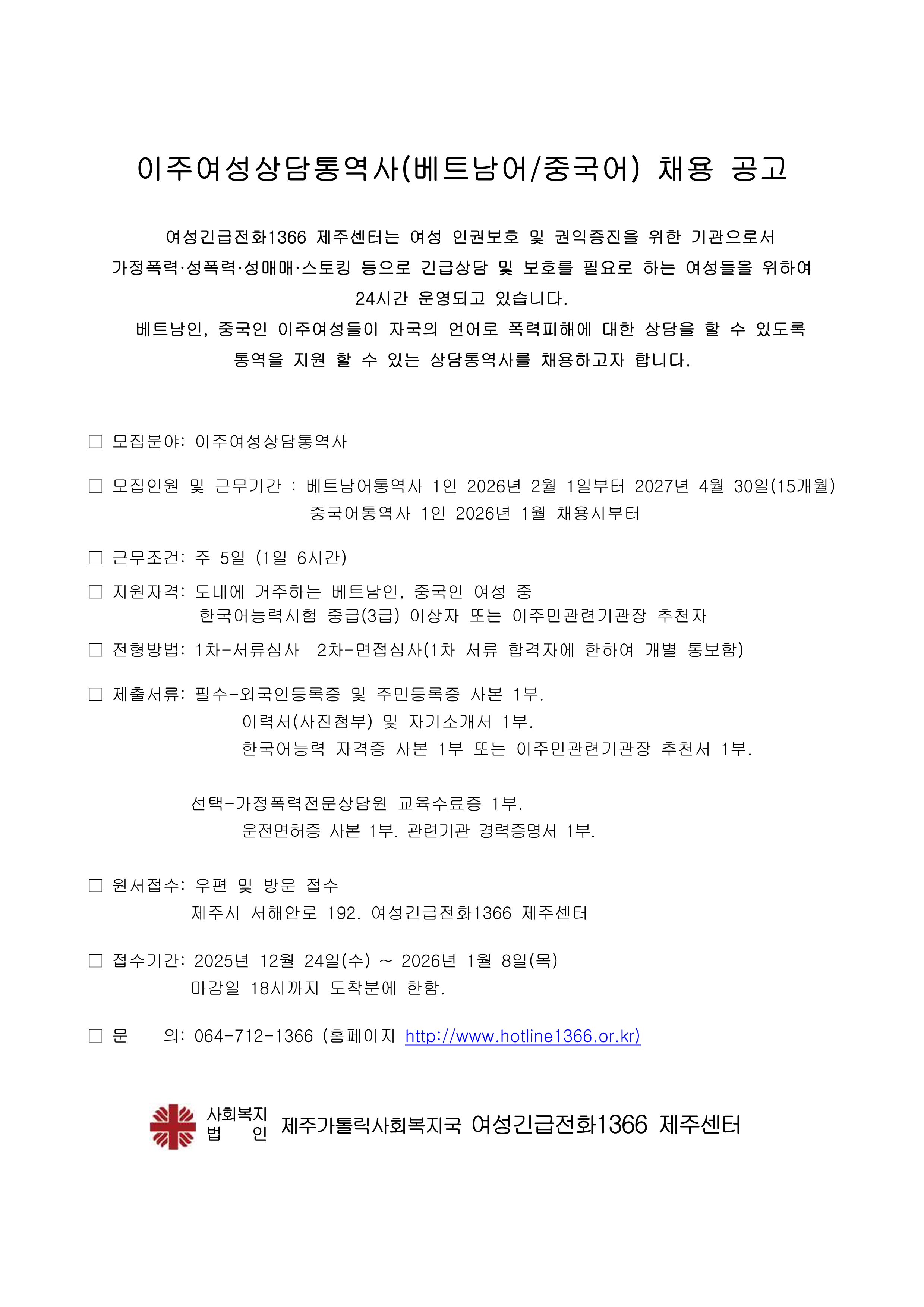 이주여성상담통역사 공개채용(베트남어, 중국어)