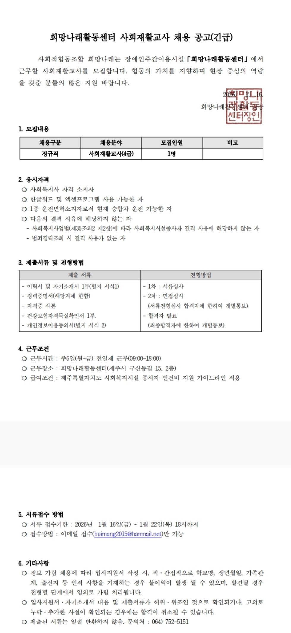 [희망나래활동센터] 사회재활교사 채용 재공고(긴급)